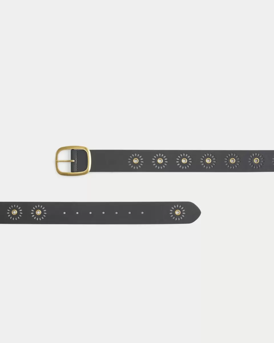 Cette jolie ceinture en similicuir présente des détails en forme de soleil et des œillets métalliques. Boucle en métal. Importée.