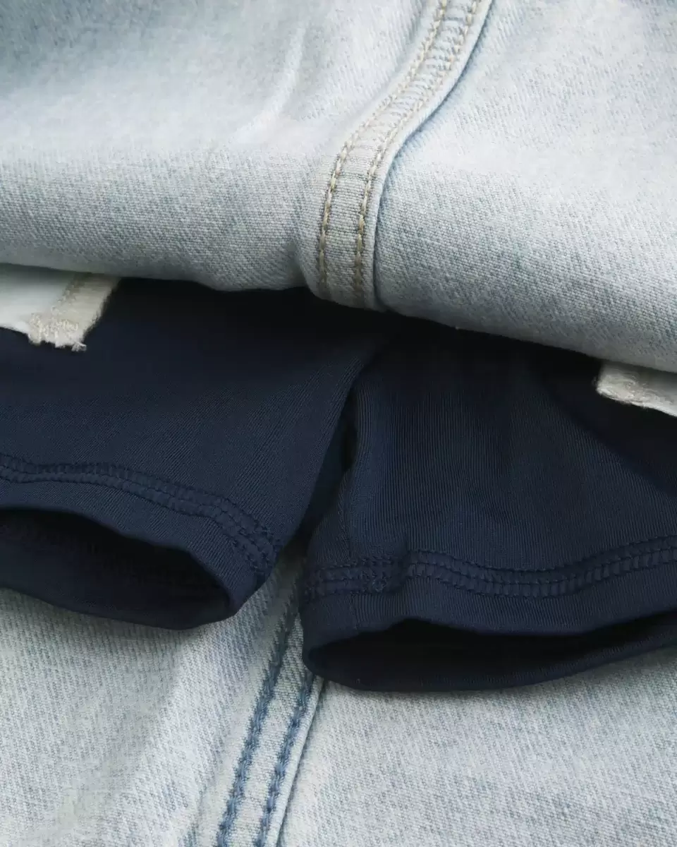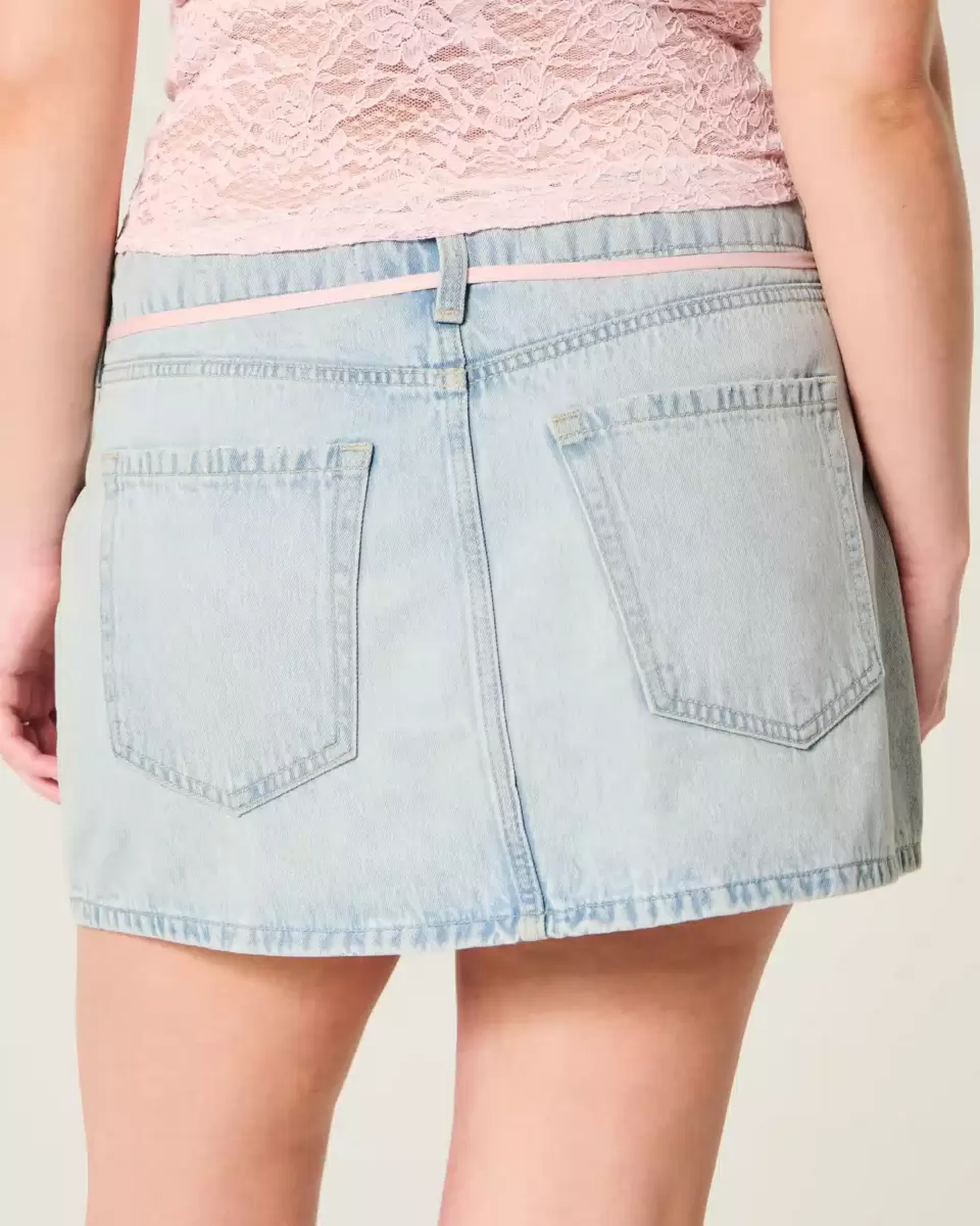 Mini-jupe en jean, mignonne et confortable, au délavage clair, avec taille basse et short en maille dissimulé. Ceinture à lacets amovible, effet délavé et effet moustaches. Importé.