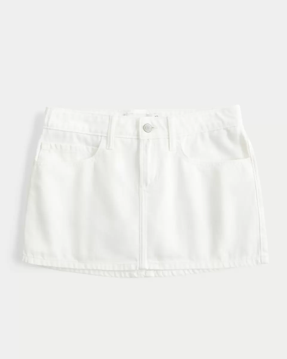 Une jolie mini-jupe en jean avec une taille basse et un short en tricot dissimulé. Blanche. Importée.