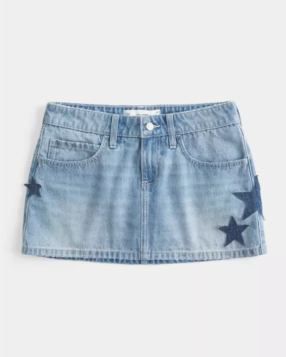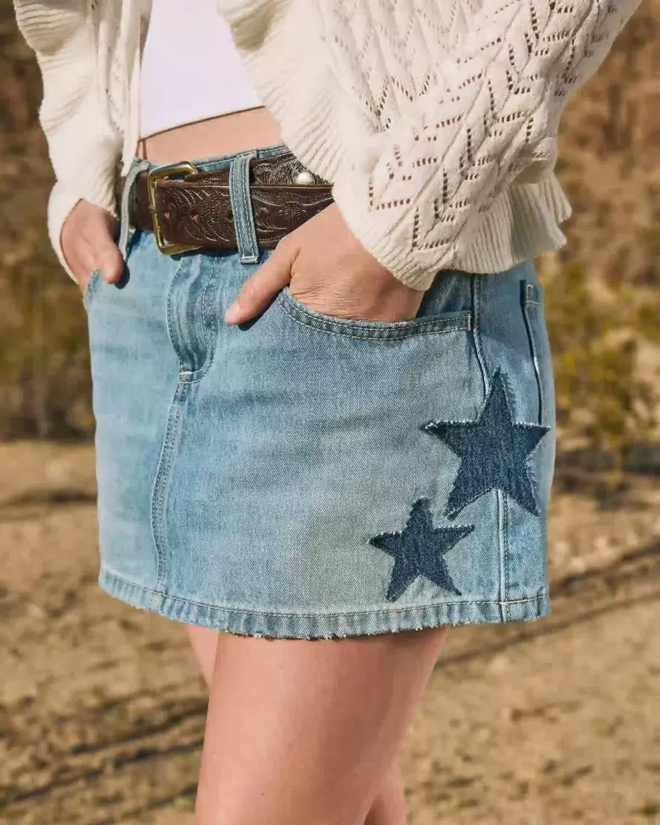 Une jolie mini-jupe en jean au délavage moyen, conçue avec une taille basse et un short intégré avec poche pour téléphone. Décoloration, effet moustaches, appliqué étoile. Importé.