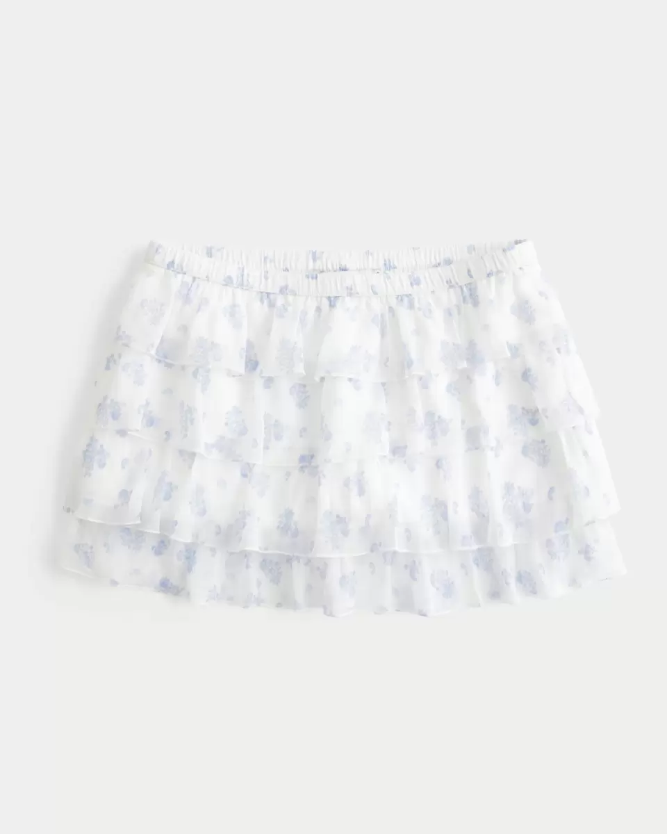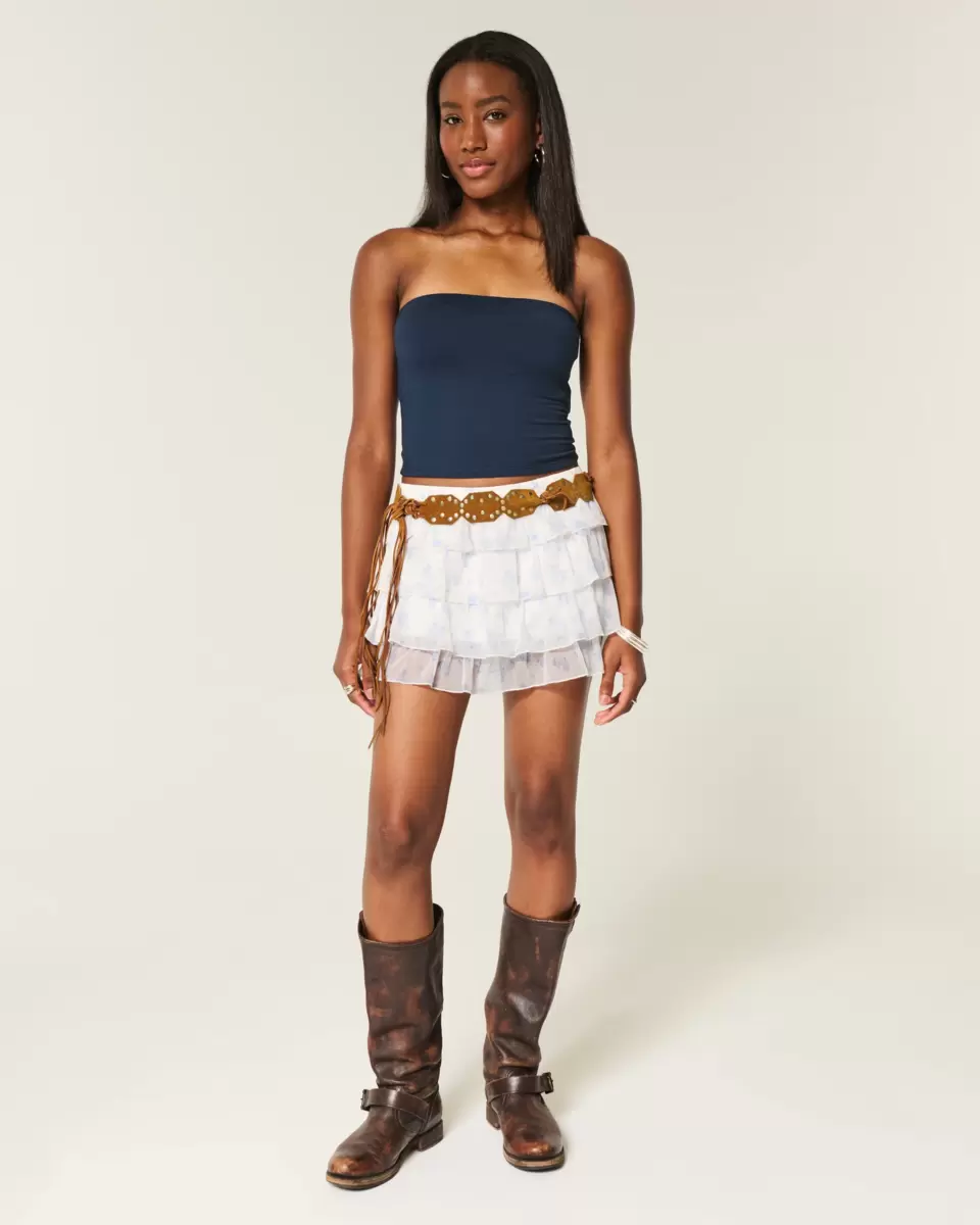 Une jolie mini-jupe ultra douce, avec une taille basse et des volants superposés. Short en tricot intégré, poches. Importé.
