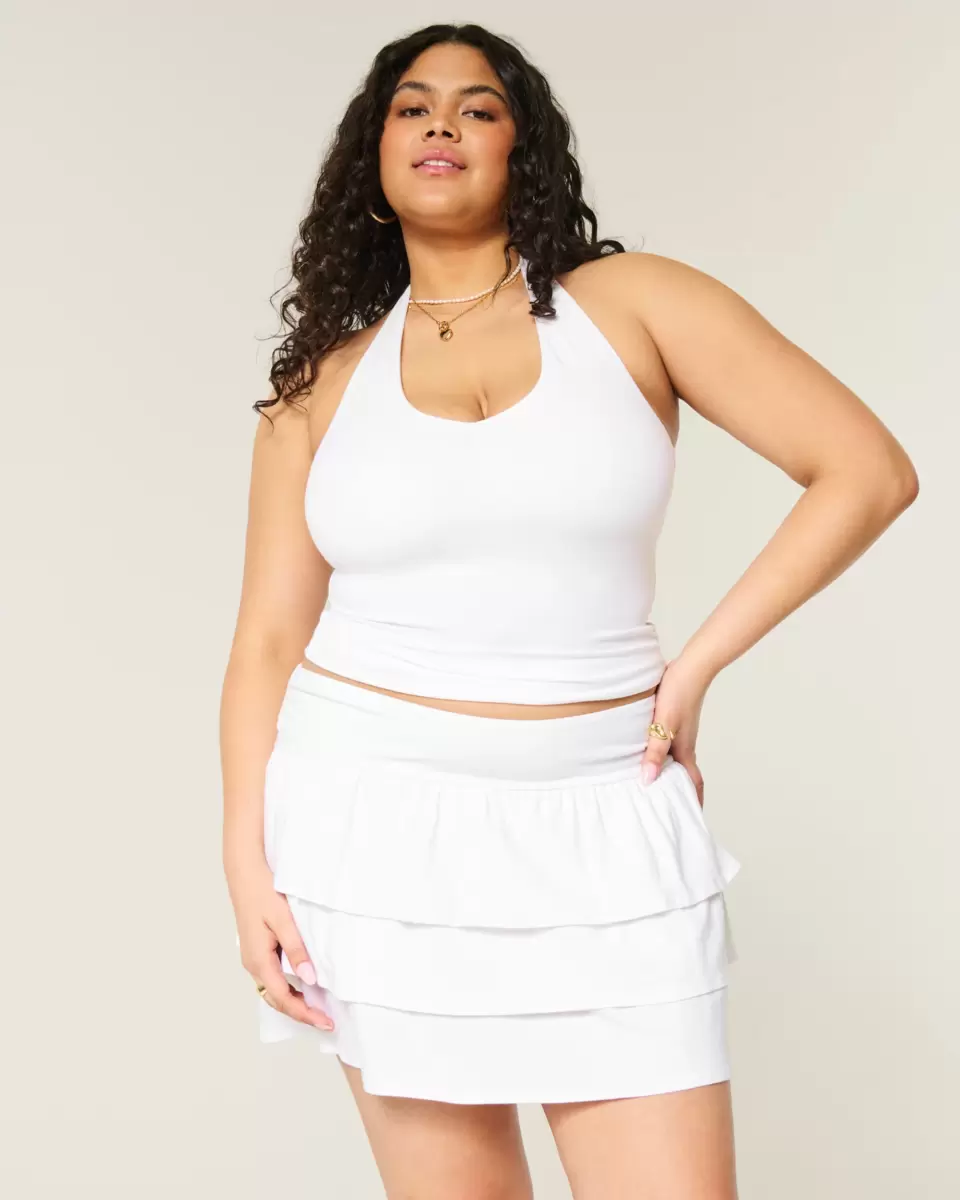 Cette jolie mini-jupe est conçue avec une taille mi-haute et un short en tricot dissimulé avec une poche latérale pour téléphone. Tissu en tricot doux et extensible, jolis volants superposés. Importé.