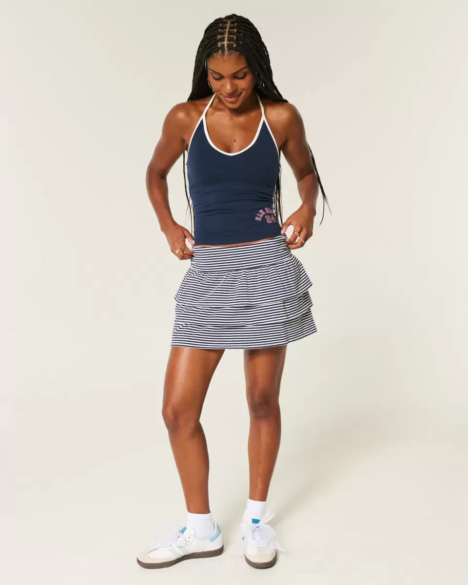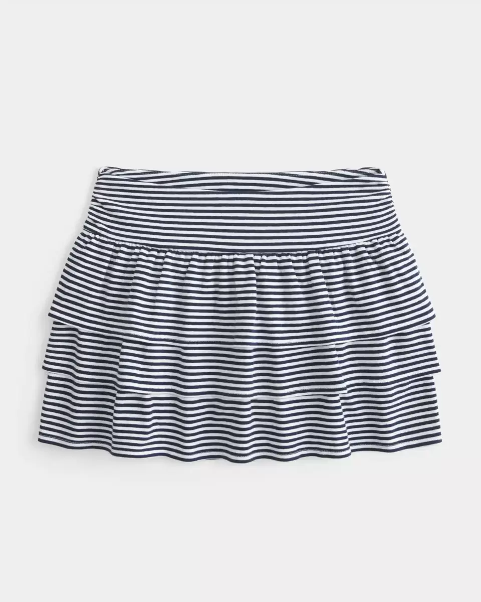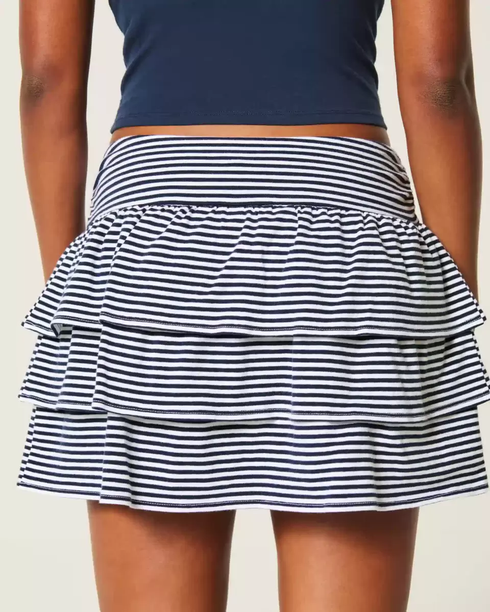 Cette jolie mini-jupe est conçue avec une taille mi-haute et un short en tricot dissimulé avec une poche latérale pour téléphone. Tissu en tricot doux et extensible, jolis volants superposés. Importé.