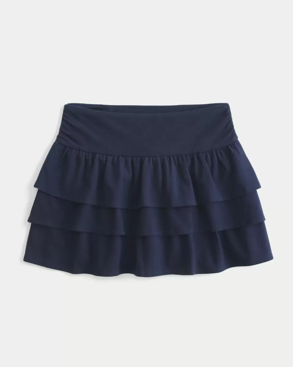 Cette jolie mini-jupe est conçue avec une taille mi-haute et un short en tricot dissimulé avec une poche latérale pour téléphone. Tissu en tricot doux et extensible, jolis volants superposés. Importé.