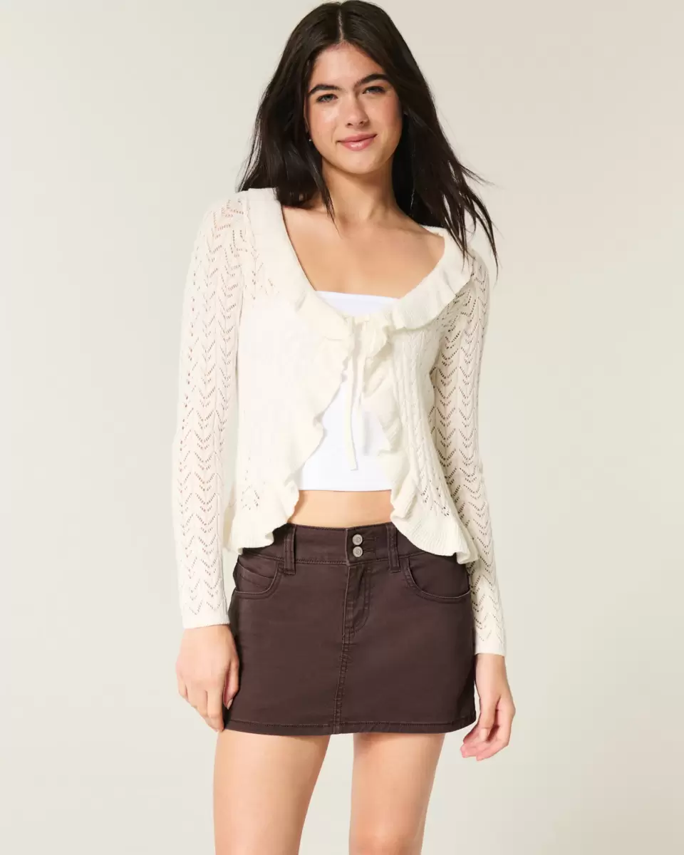 Une jolie mini-jupe en sergé conçue avec une taille basse et un short en tricot caché.