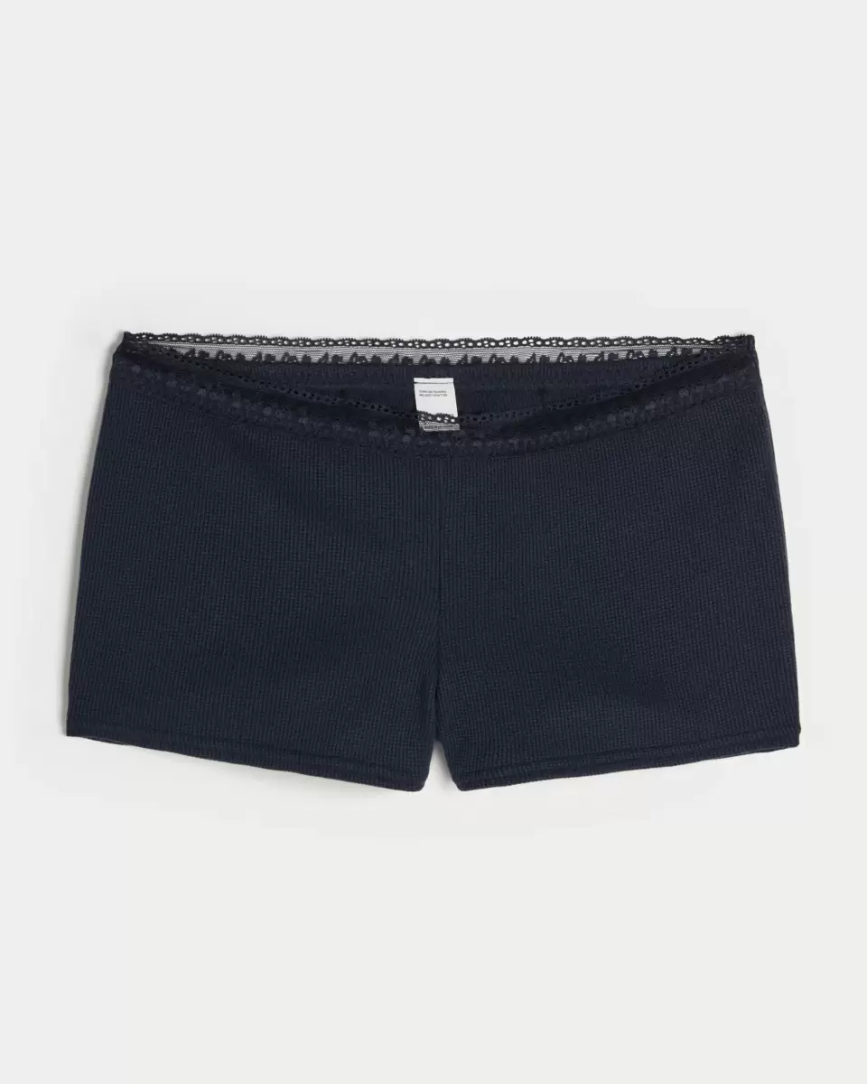 Shorty ultra doux et confortable en tissu gaufré avec une jolie bordure en dentelle à la taille. Importé.