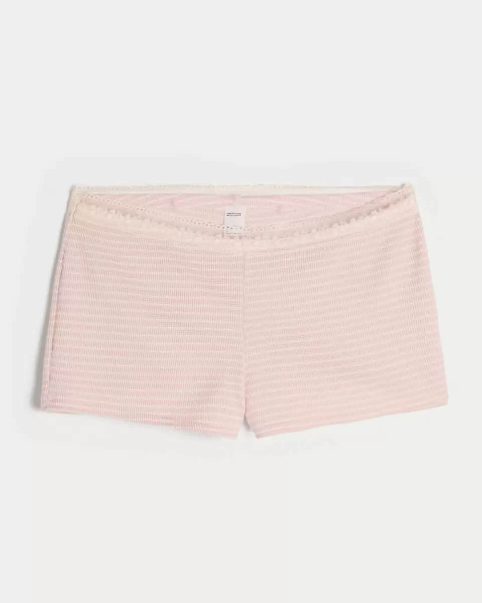 Shorty ultra doux et confortable en tissu gaufré avec une jolie bordure en dentelle à la taille. Importé.