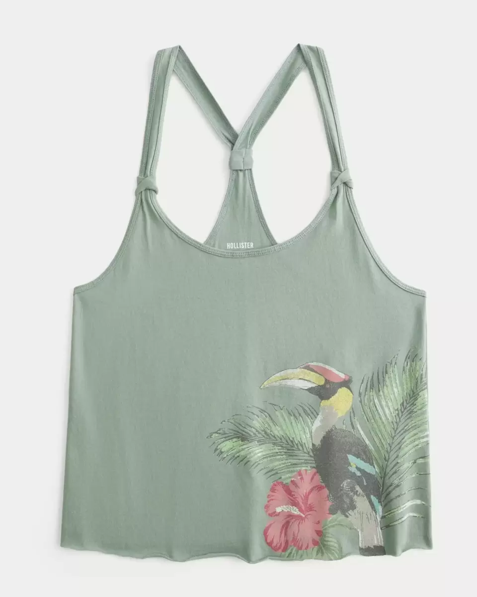Tendance ! Un débardeur 100 % coton ultra doux avec un imprimé d’oiseaux tropicaux. Coupe facile. Importé.