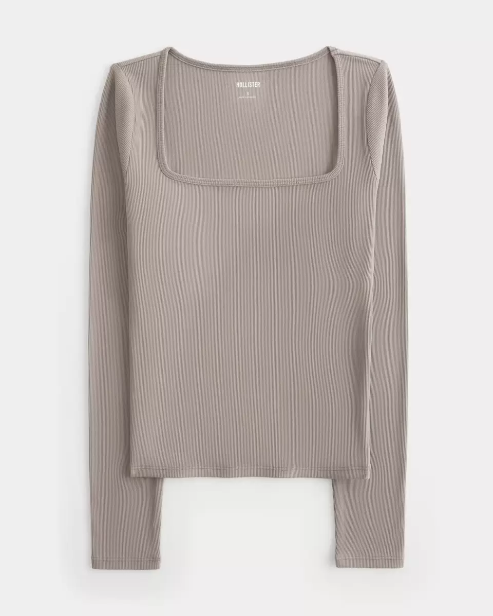 Haut à manches longues ultra-doux et confortable en tissu côtelé, sans coutures apparentes. Encolure carrée, manches longues. Coupe ajustée. Importé.