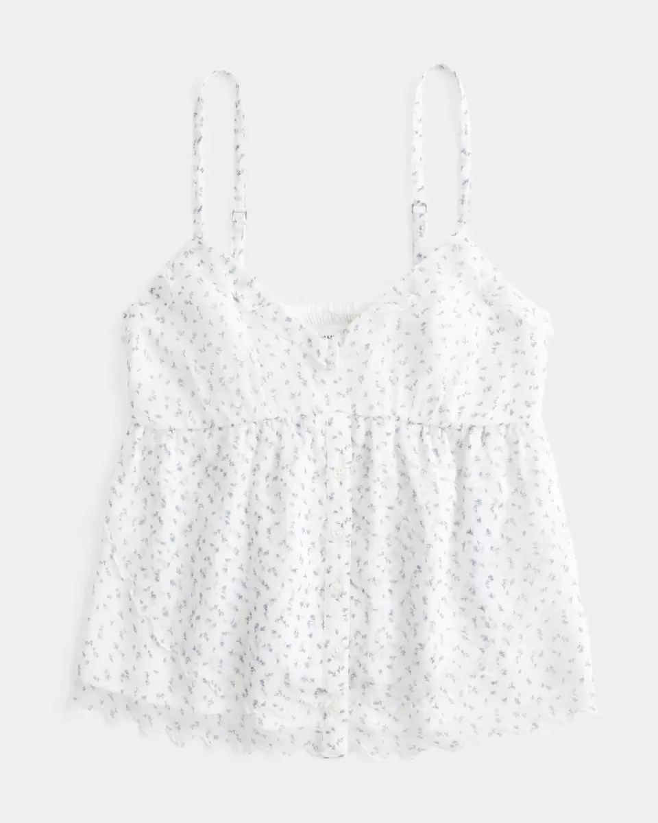 Confectionné en mousseline froissée ultra douce et fluide, ce haut babydoll est orné de volants et d’un ourlet à volants brodé. Il est boutonné et doté d’un dos à smocks doux. Il est superbe, aussi bien habillé qu’en tenue décontractée ! Importé.