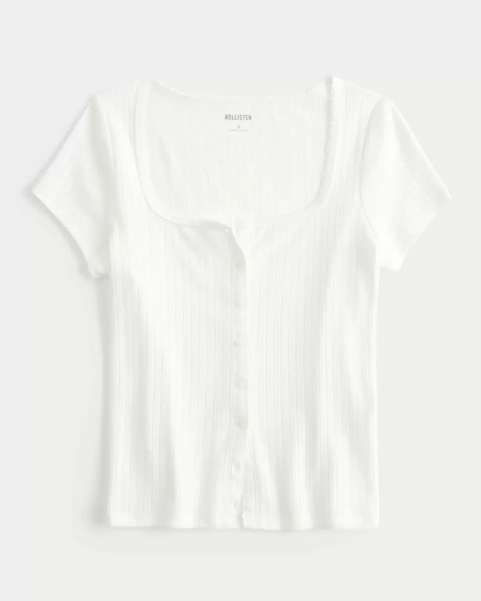 Ce haut mignon et confortable est confectionné en pointelle ultra doux. Fermeture boutonnée, manches courtes et encolure carrée. Coupe ajustée. Importé.