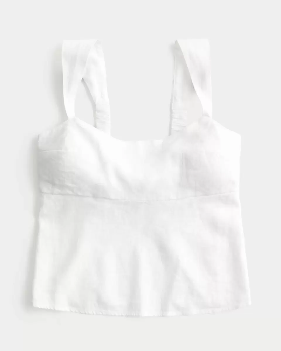 Confectionné dans un mélange de lin doux, ce joli haut présente un dos ouvert avec fermeture à nouer. Coussinets intégrés et larges bretelles. Coupe ajustée. Importé.