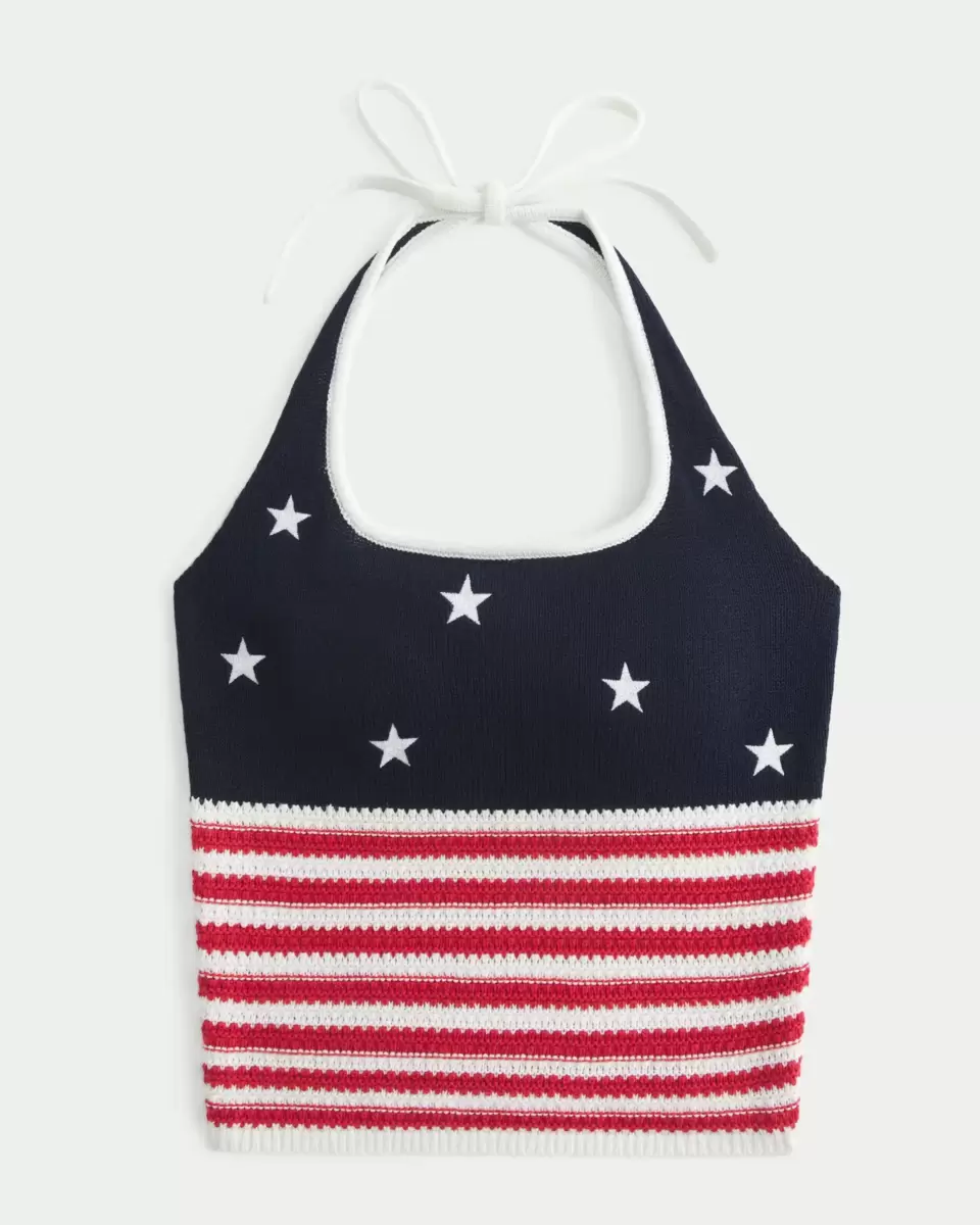 Un haut confortable et ultra doux en tissu crocheté, orné d’un motif étoiles et rayures du drapeau américain. Bretelles dos nu, poitrine doublée, encolure carrée. Coupe ajustée. Importé.