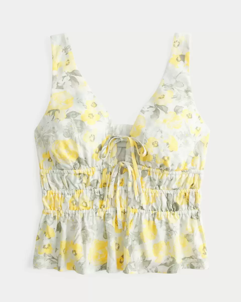 Un joli haut péplum en mélange de lin doux, avec un lien à nouer sur le devant et une taille échancrée. Encolure en V. Coupe ajustée. Importé.