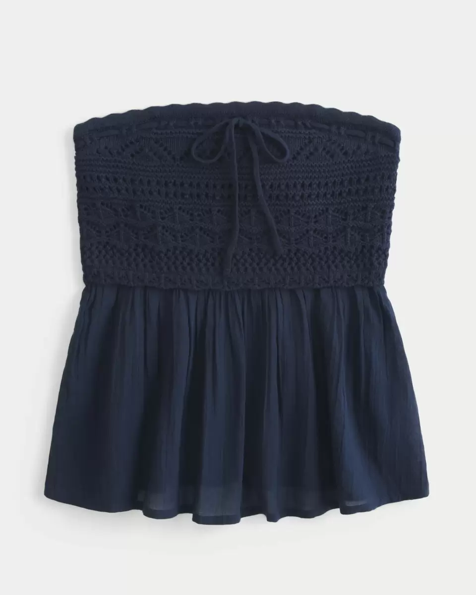 Joli et ultra doux, ce haut babydoll sans bretelles présente un buste en tissu crocheté avec un lien à nouer à l’encolure et un ourlet fluide. Coupe facile. Importé.