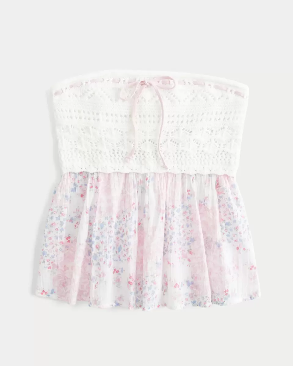 Joli et ultra doux, ce haut babydoll sans bretelles présente un buste en tissu crocheté avec un lien à nouer à l’encolure et un ourlet fluide. Coupe facile. Importé.