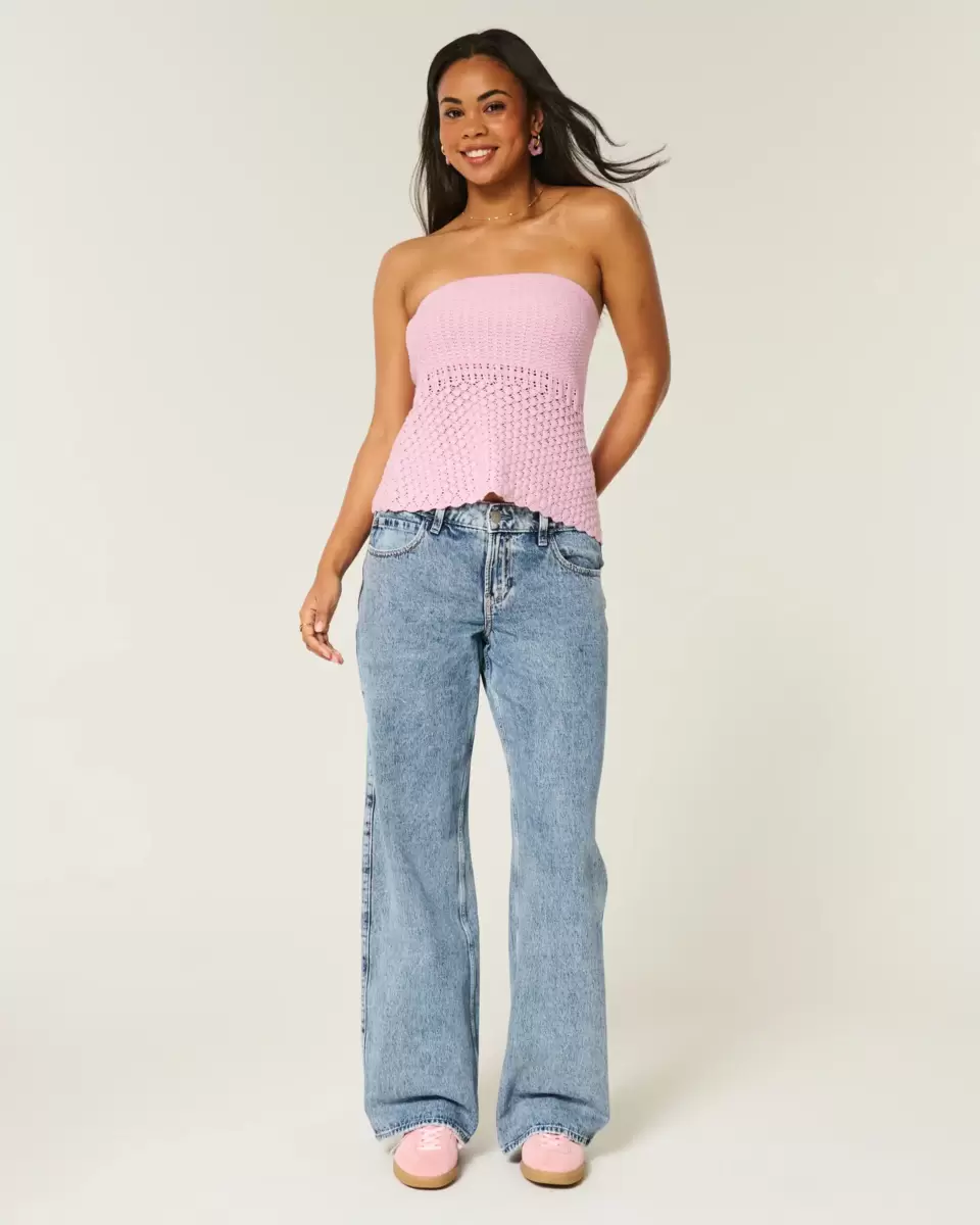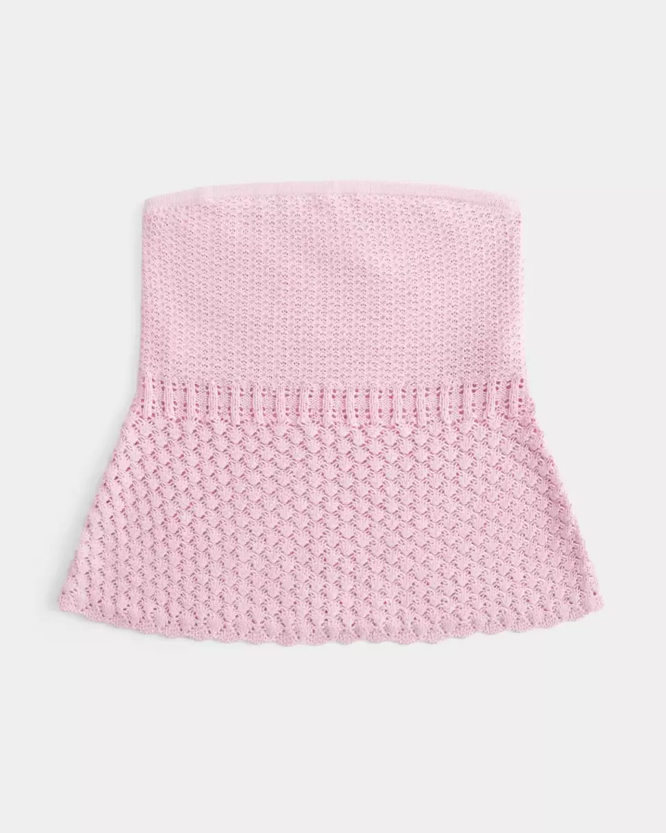 Pull tube ultra doux au crochet, doublé au niveau de la poitrine. Coupe ajustée au niveau de la poitrine et coupe babydoll plus ample à la taille. Sans bretelles. Coupe ajustée. Importé.