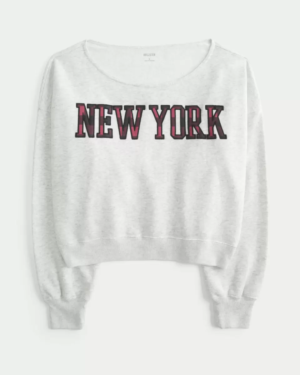 Ce sweat-shirt en polaire confortable et ultra doux arbore un imprimé New York appliqué et une encolure dégagée. Manches longues et coupe courte.