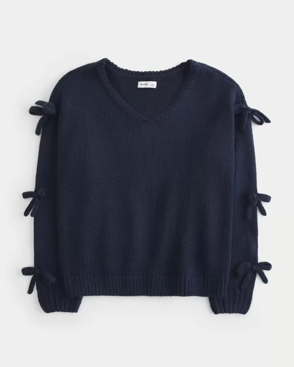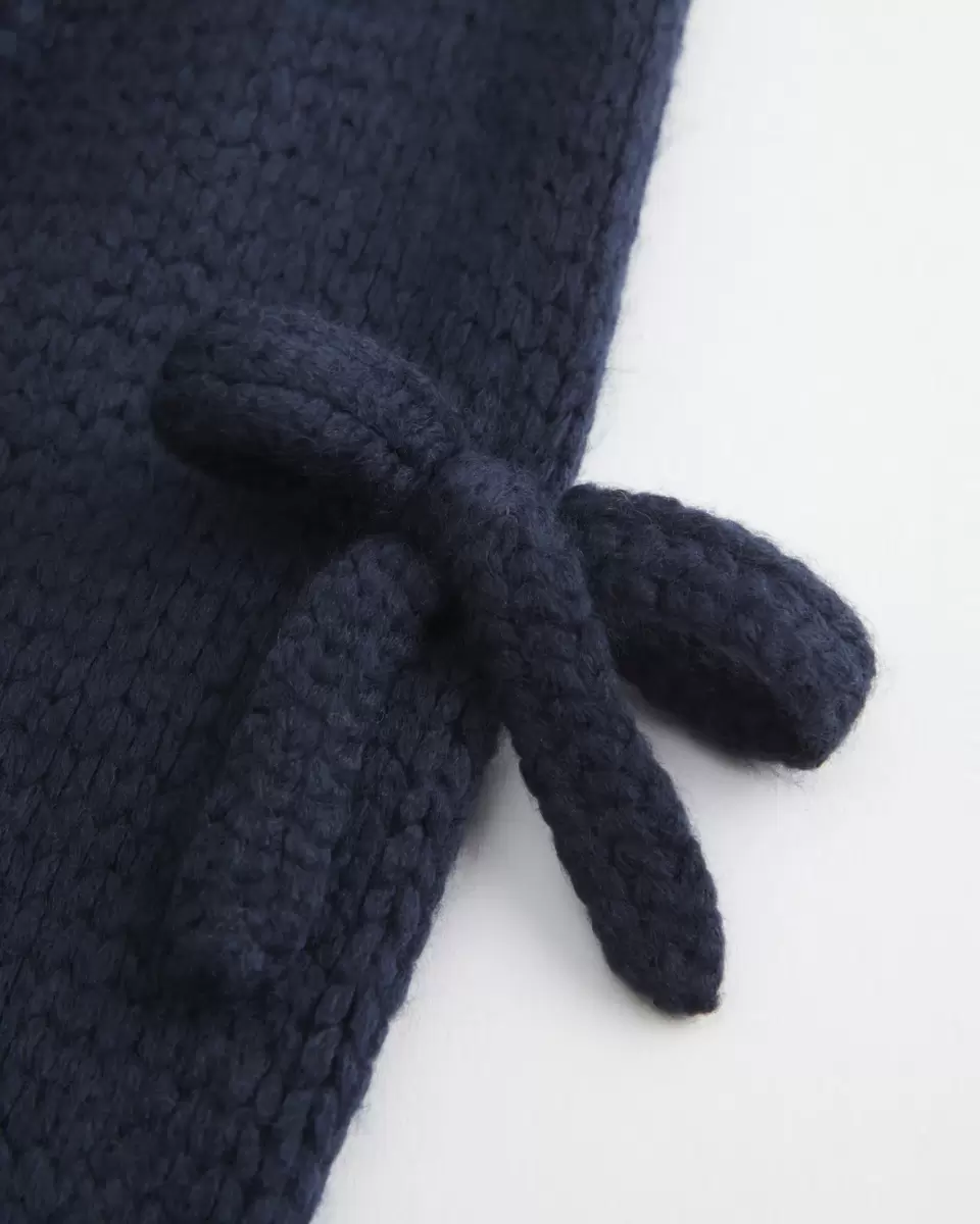 Super doux et incroyablement confortable, ce pull présente des nœuds appliqués aux manches et une encolure ample qui peut être portée sur une épaule. Manches longues, bords côtelés. Coupe oversize. Importé.