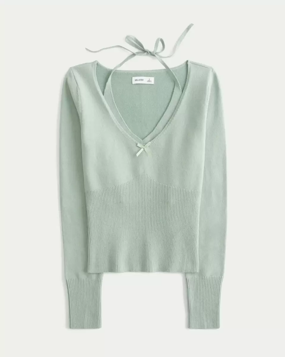 Ce pull ultra doux présente une encolure en V avec un lien fin en dessous pour un look superposé. Manches longues, bords côtelés, encolure en V avec un joli nœud. Coupe ajustée. Importé.