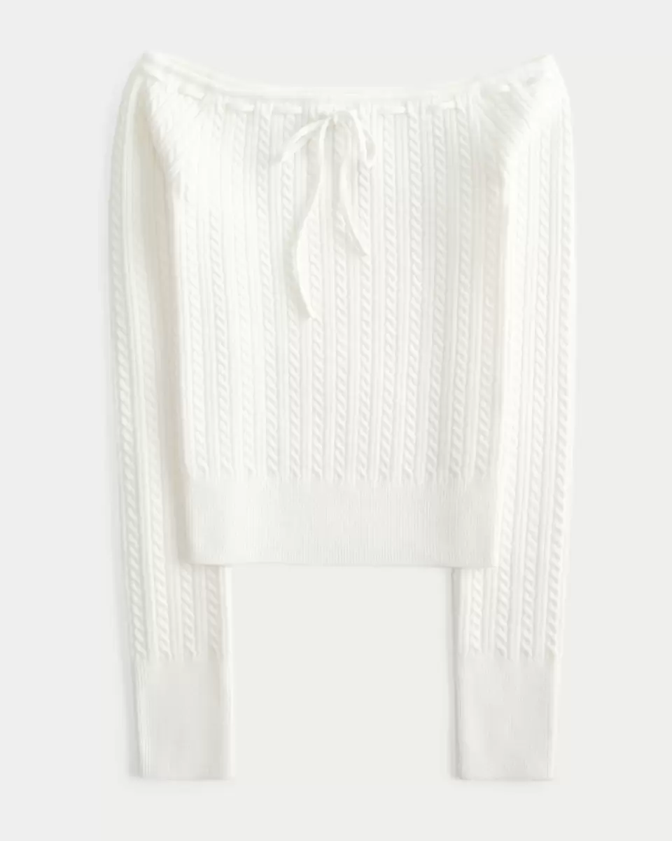 Mignon et confortable, ce pull ultra doux présente des motifs en maille torsadée et une encolure épaules dénudées avec passementerie. Manches longues, bords côtelés. Coupe ajustée. Importé.
