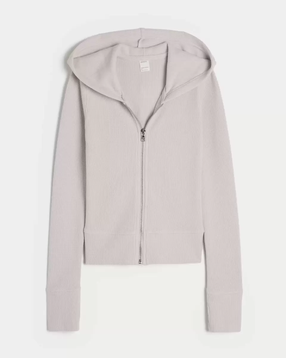 Un sweat à capuche mignon et confortable en tissu gaufré ultra doux. Fermeture éclair sur toute la longueur, capuche, manches longues avec ouvertures pour les pouces. Coupe ajustée. Importé.