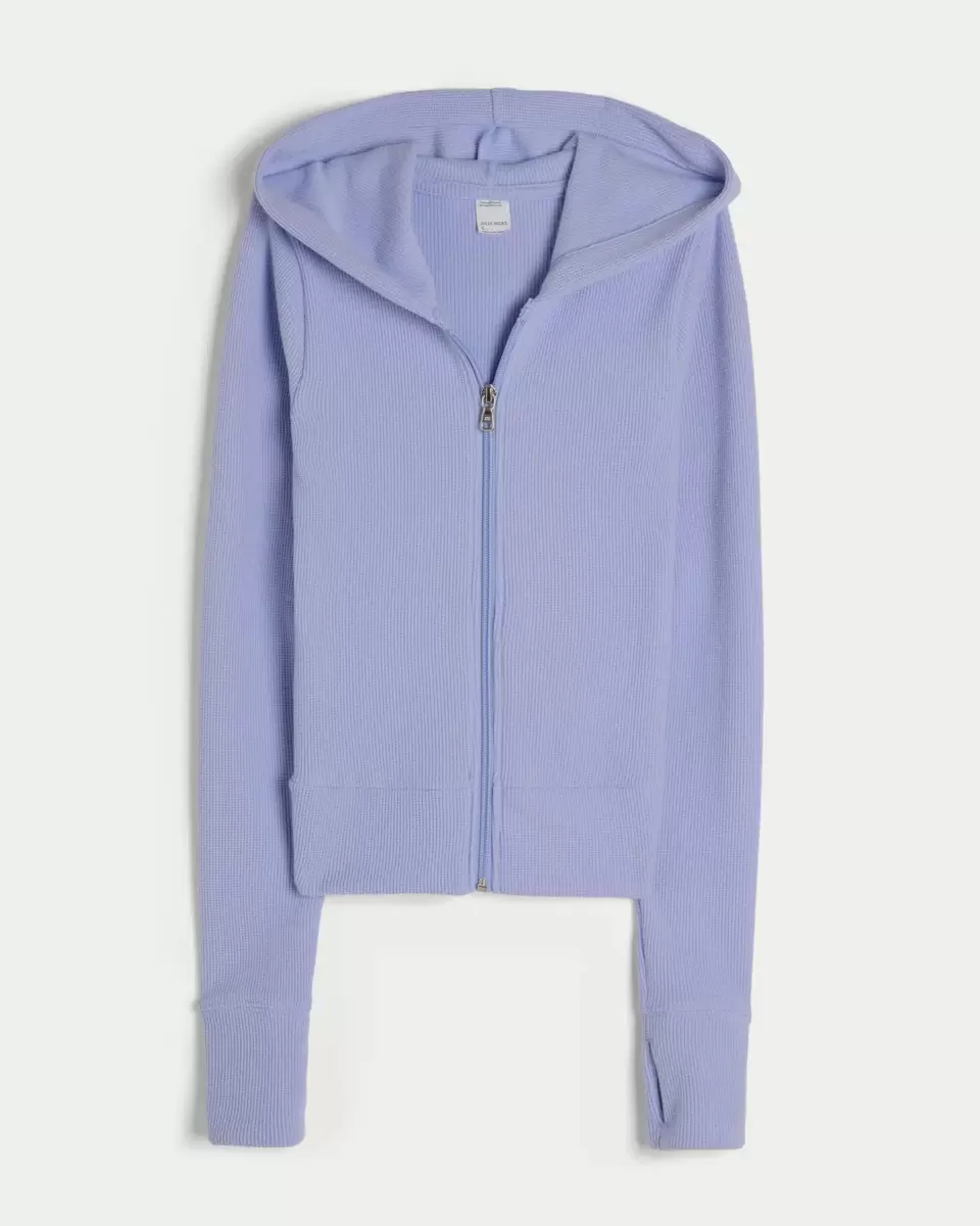 Un sweat à capuche mignon et confortable en tissu gaufré ultra doux. Fermeture éclair sur toute la longueur, capuche, manches longues avec ouvertures pour les pouces. Coupe ajustée. Importé.