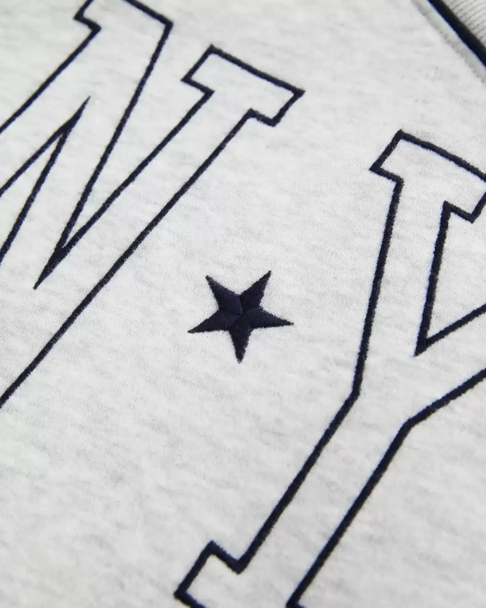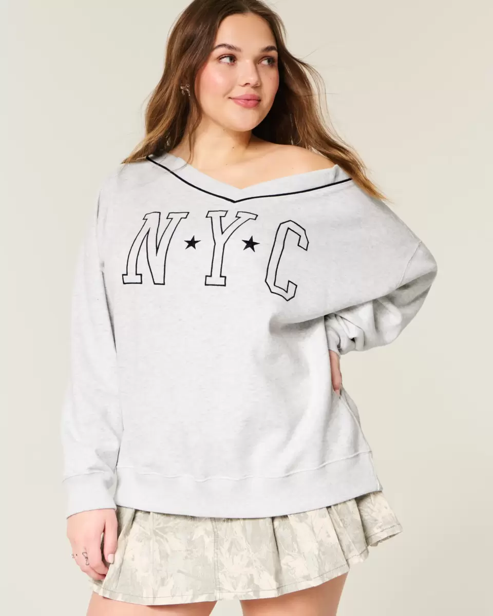 Ce sweat-shirt en polaire confortable et ultra doux arbore une broderie graphique NYC et un décolleté en V à épaules dénudées. Manches longues. Coupe oversize.