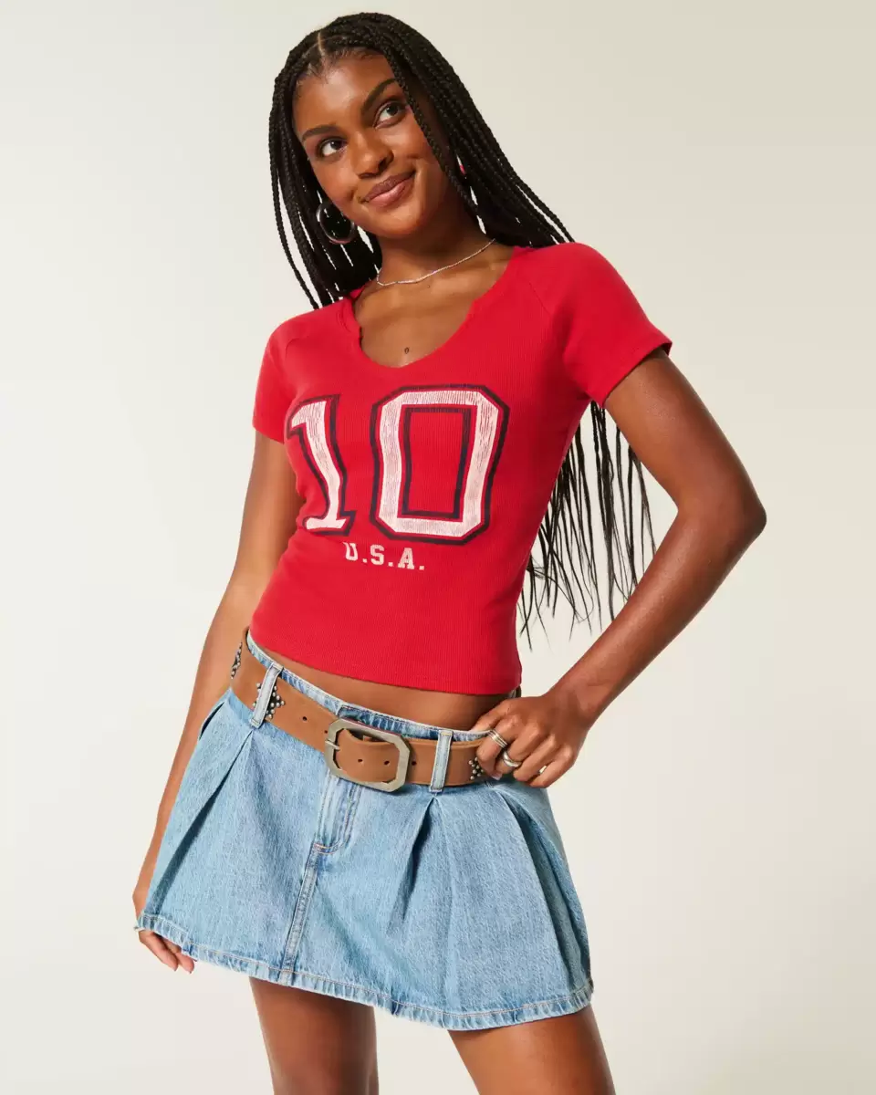 Un t-shirt bébé mignon et confortable en tissu côtelé doux, légèrement raccourci. Encolure crantée, imprimé sportif USA et chiffres, manches courtes. Coupe facile.
