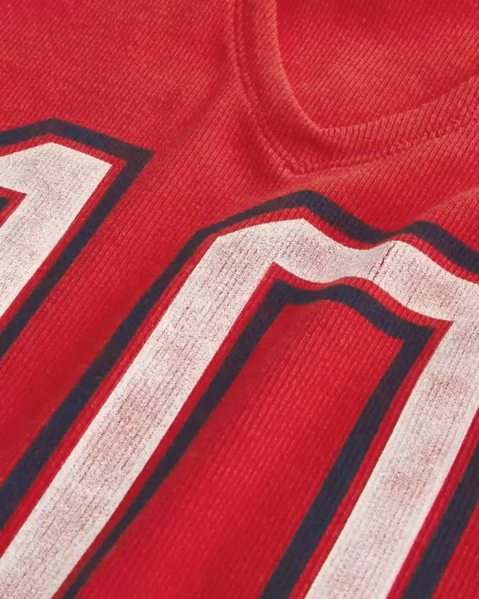 Un t-shirt bébé mignon et confortable en tissu côtelé doux, conçu avec une silhouette légèrement rétrécie. Encolure crantée, imprimé sportif USA et chiffres, manches courtes. Coupe facile. Importé.