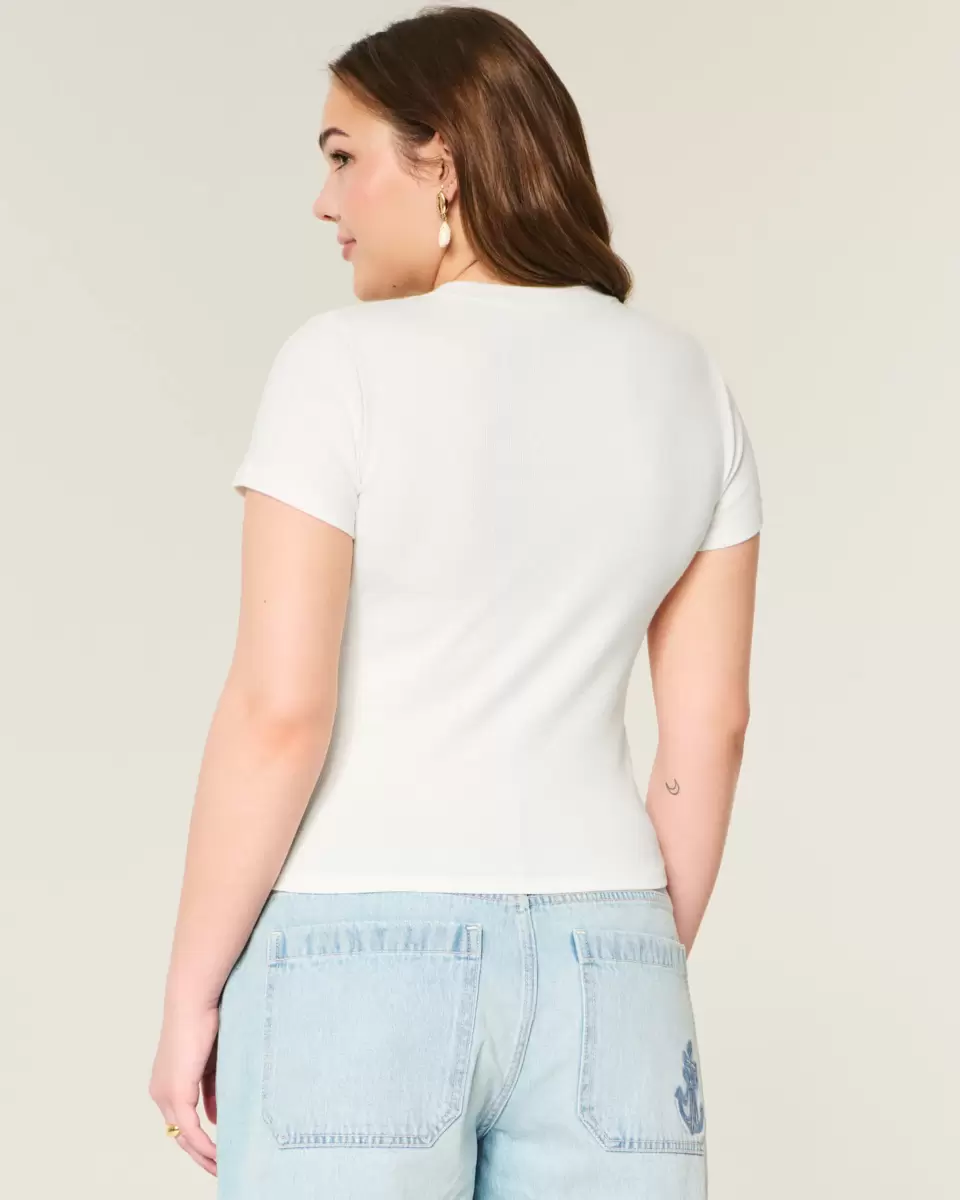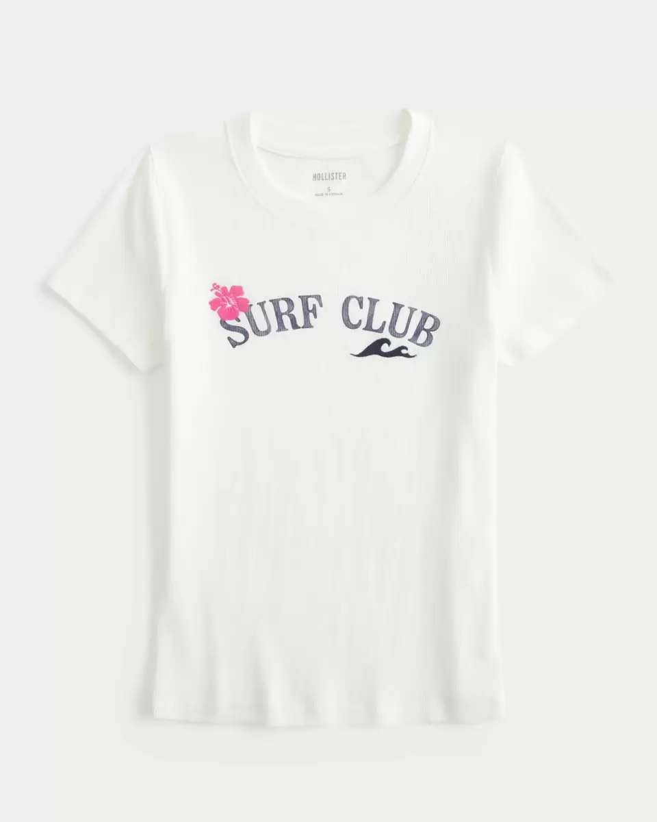Un t-shirt bébé mignon et confortable d’inspiration années 2000 en tissu côtelé ultra doux, orné d’un imprimé Surf Club. Encolure ras du cou, manches courtes, silhouette légèrement raccourcie. Coupe ajustée. Importé.