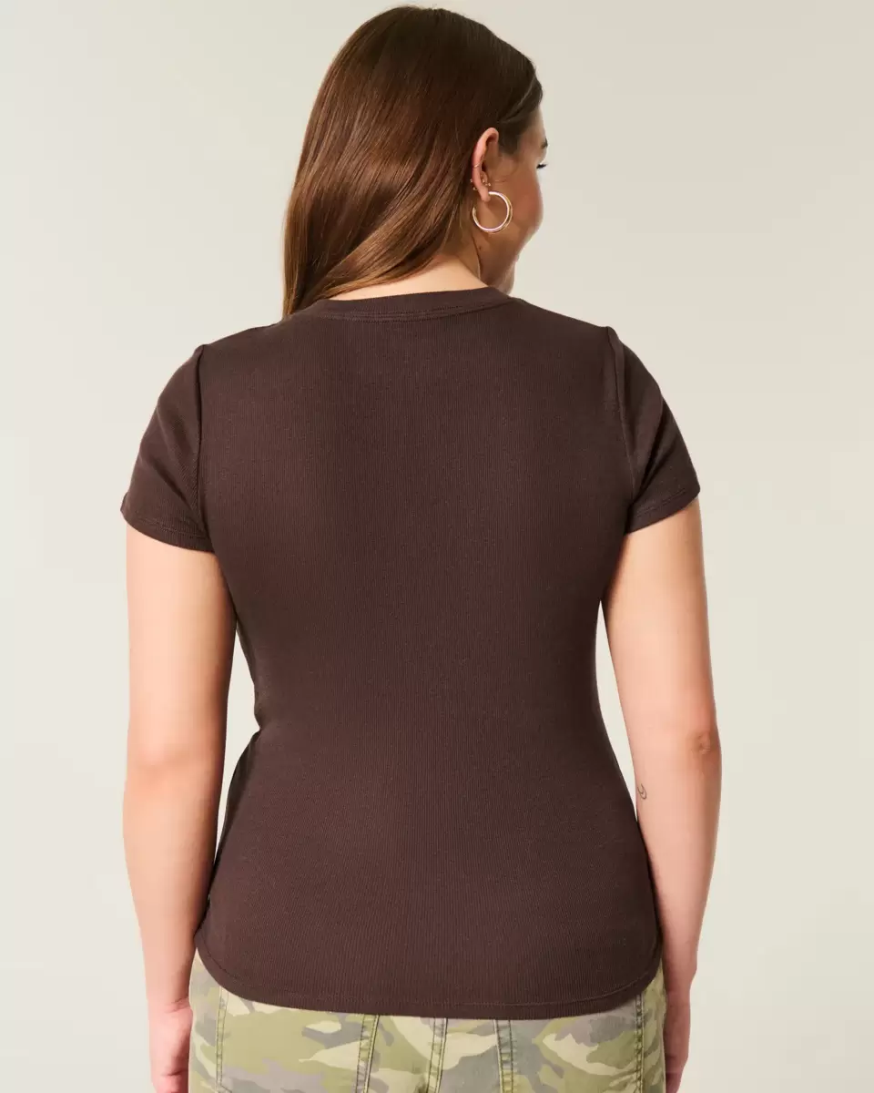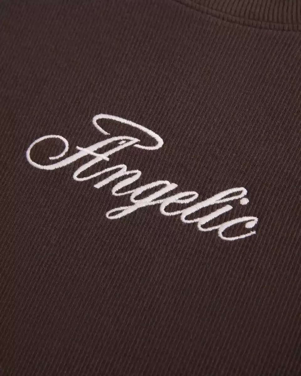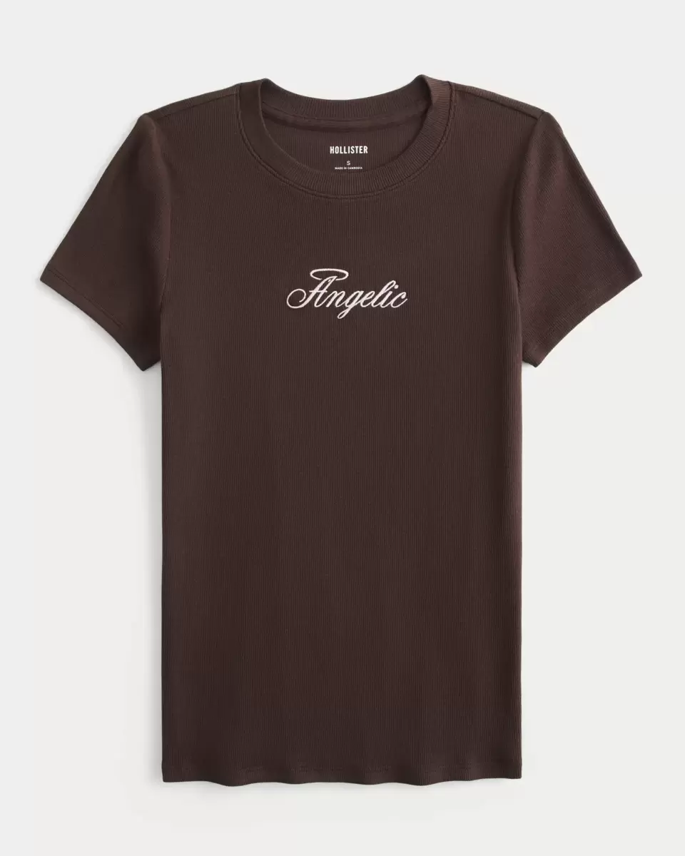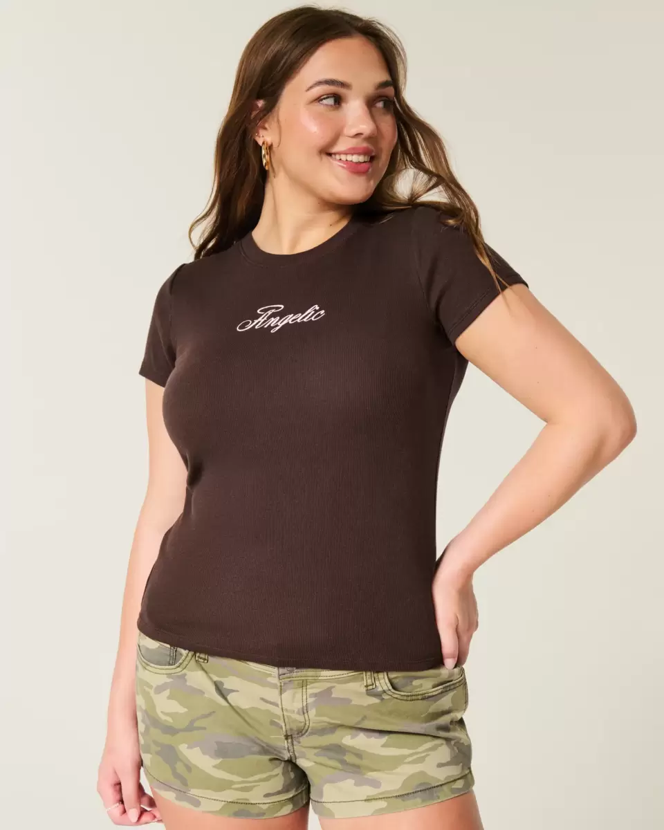 Un t-shirt bébé ultra doux d’inspiration années 2000, légèrement raccourci, avec une broderie graphique Angelic. Manches courtes, col ras du cou, tissu côtelé confortable. Coupe ajustée. Importé.