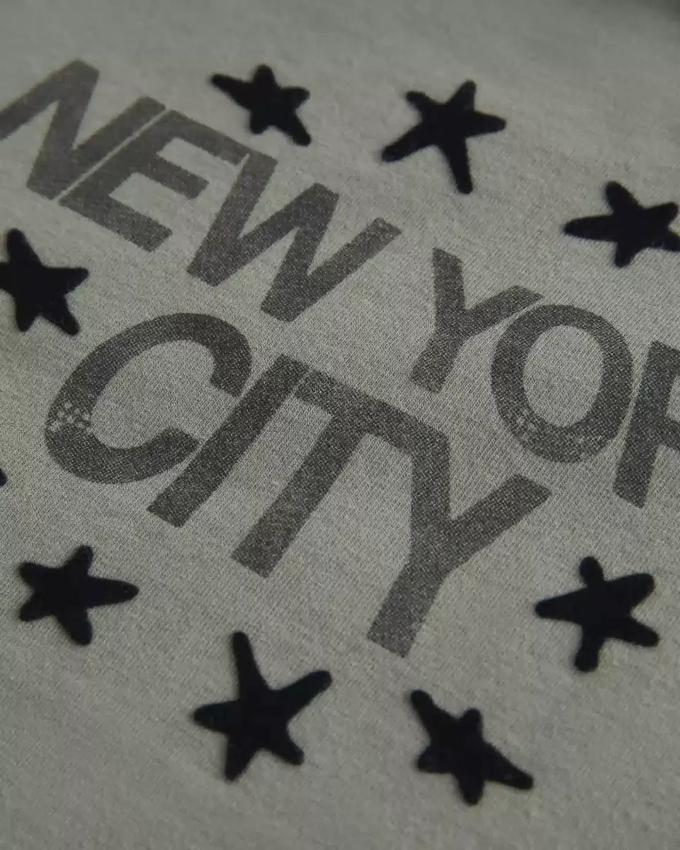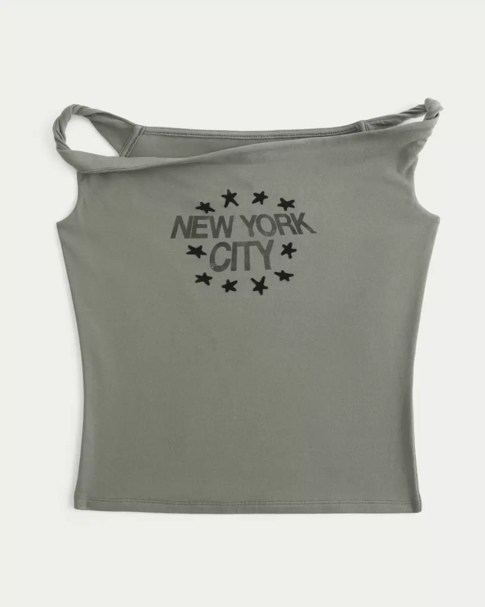 Super doux et confortable, ce t-shirt tendance arbore un imprimé New York City d’inspiration vintage et une encolure torsadée à épaules dénudées. Coupe ajustée. Importé.