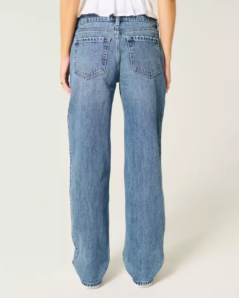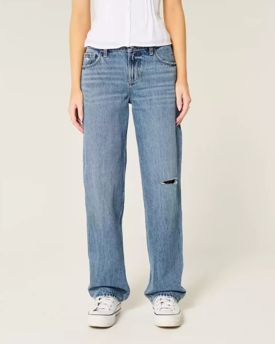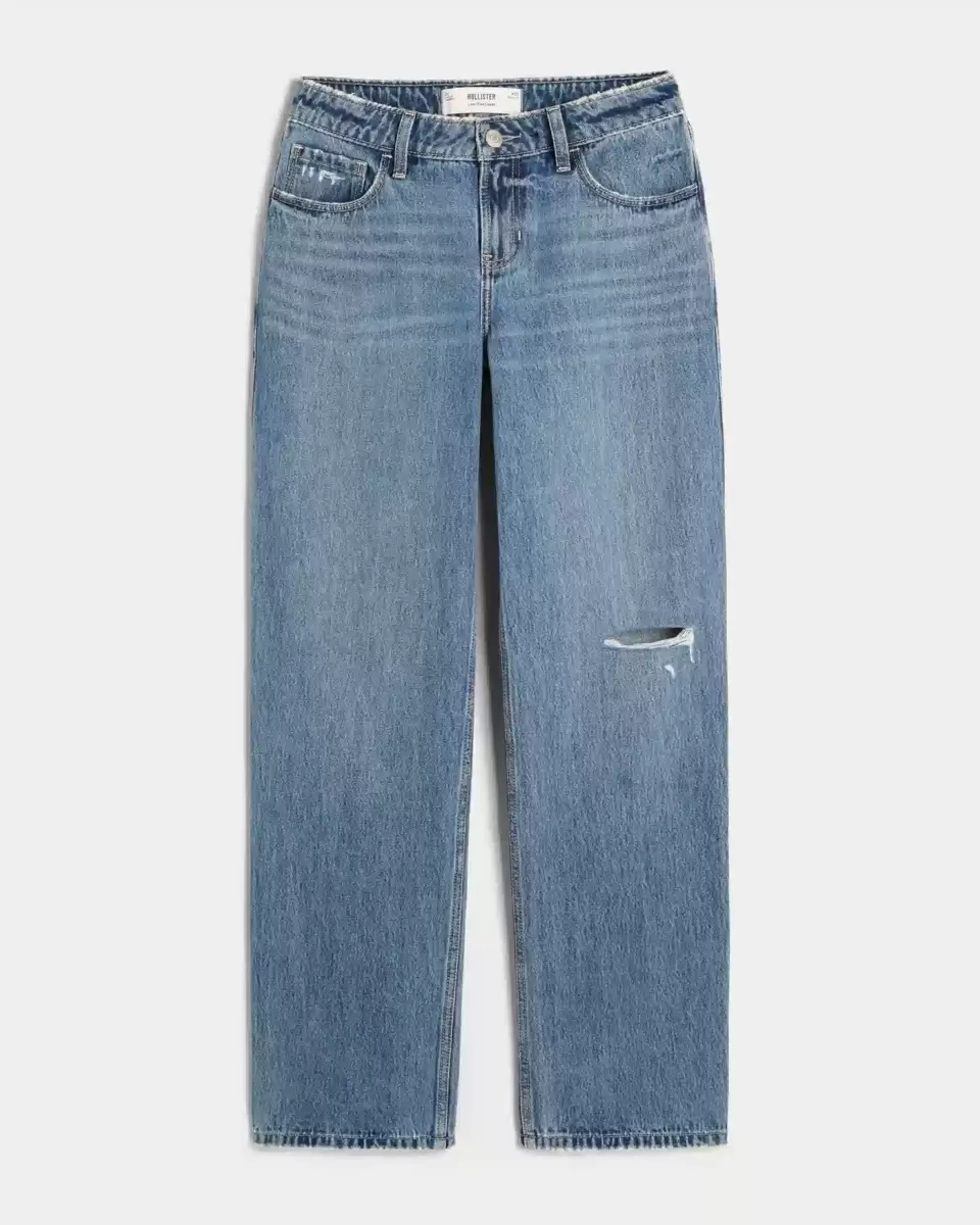 Jean confortable en denim, taille basse et jambe ample. Décoloration, moustaches, détails déchirés, délavage moyen. Importé.
