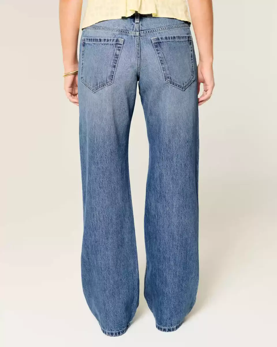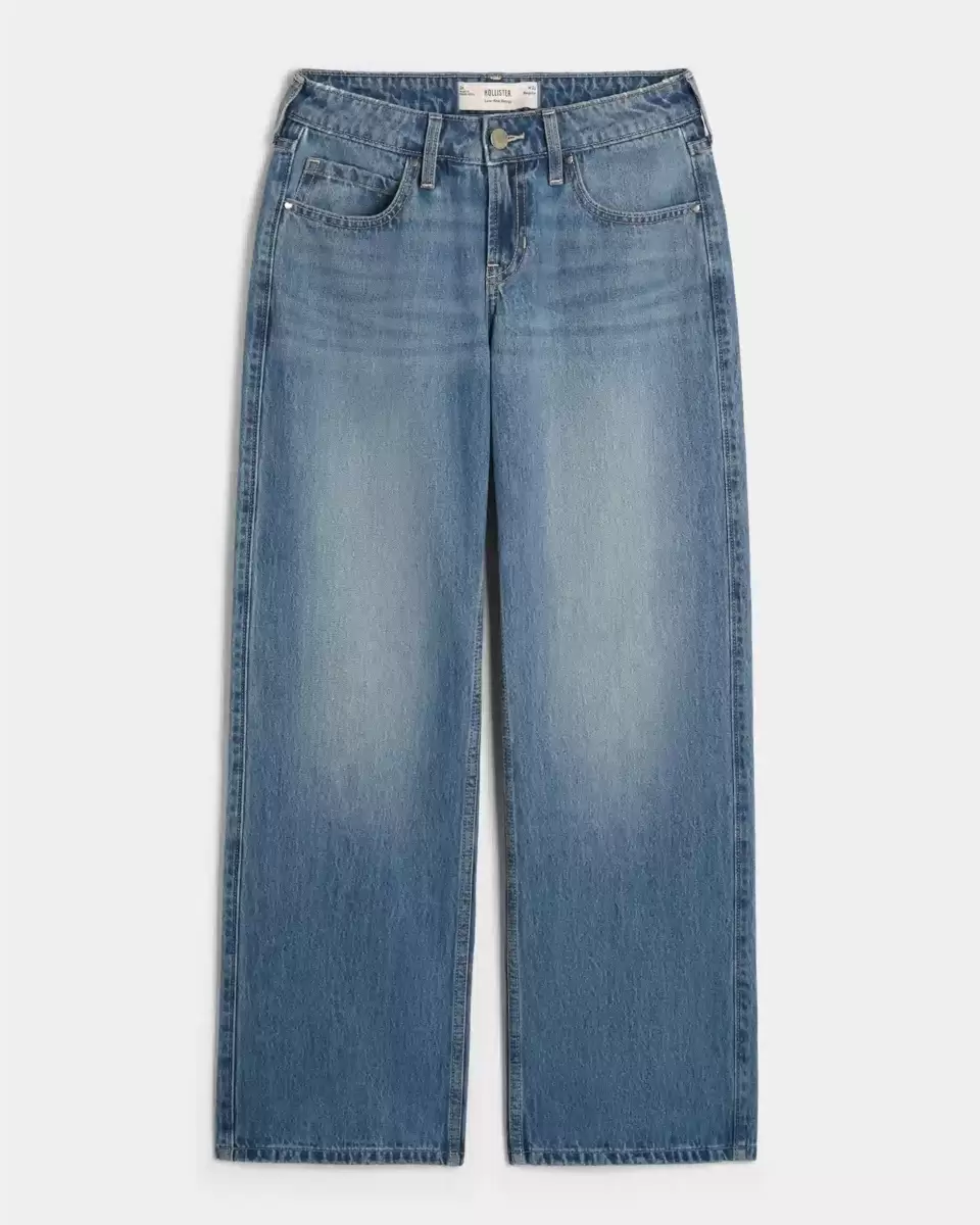 Jean confortable en denim, délavage moyen, avec jambe ample et taille basse flatteuse. Jolis détails en forme de cœur clouté en métal, décoloration et effet moustaches. Importé.