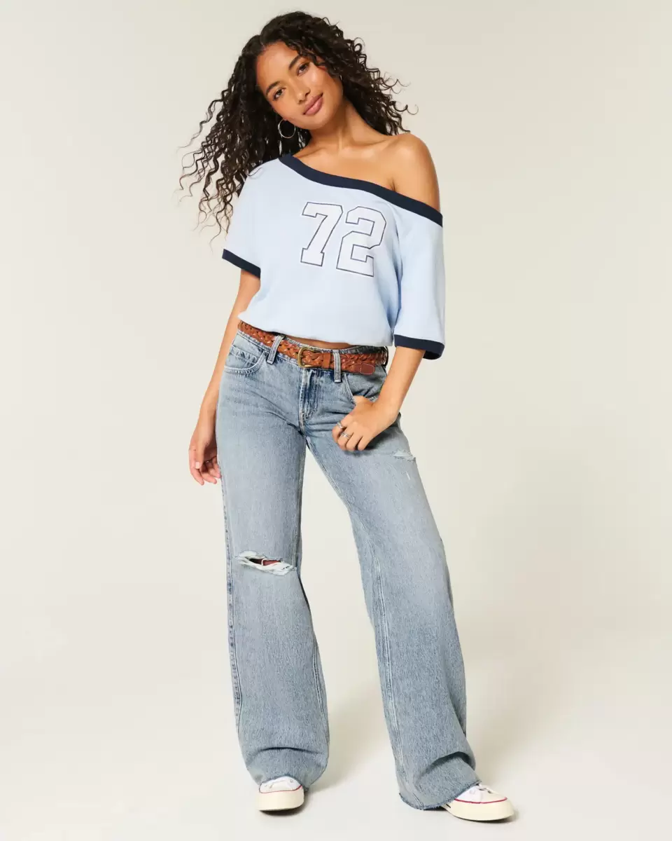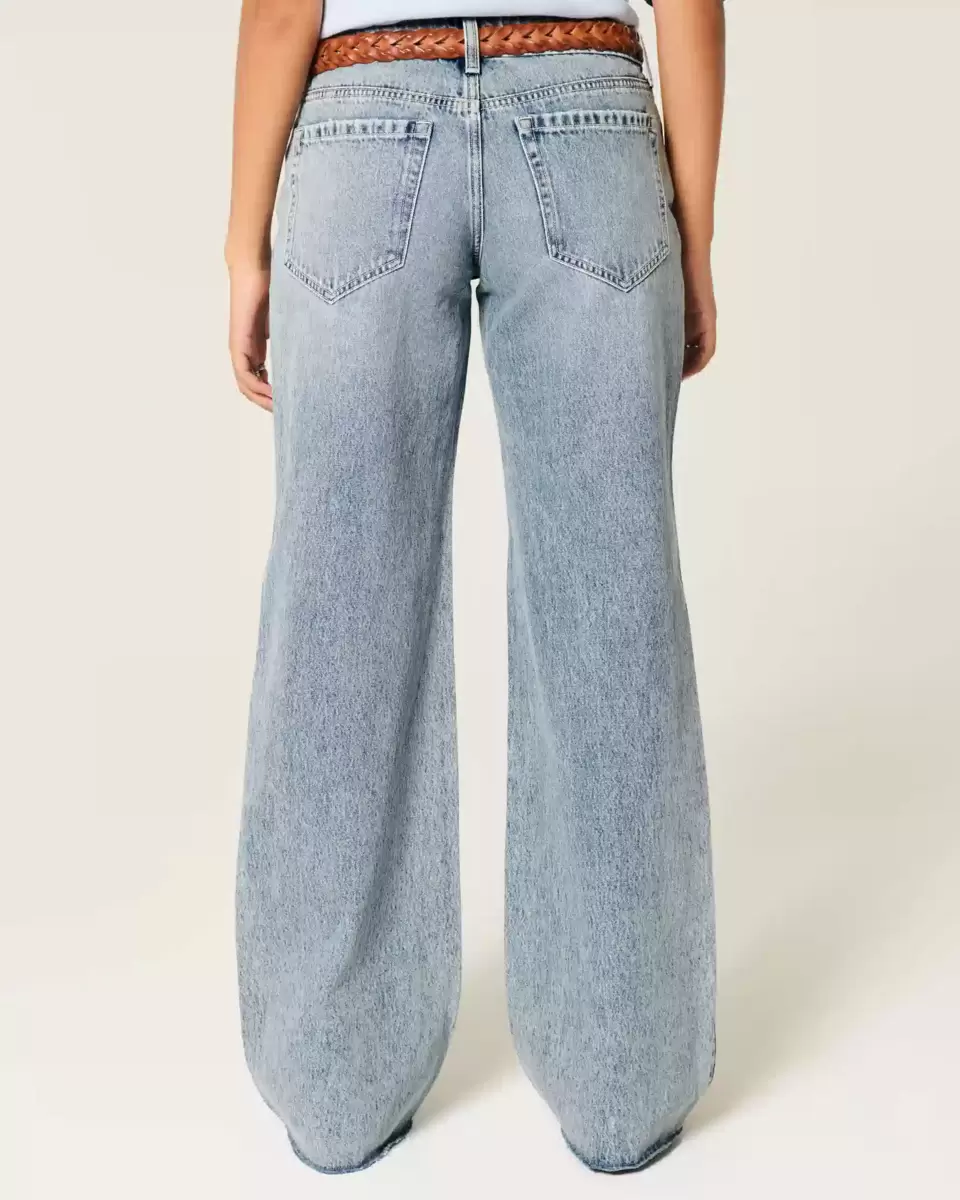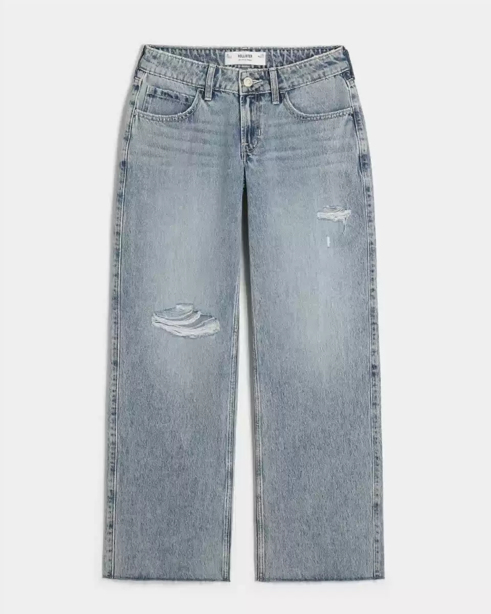 Jean confortable en denim, taille basse et jambe ample. Denim clair délavé avec détails déchirés, décoloration et moustaches. Ourlets à bords francs. Importé.