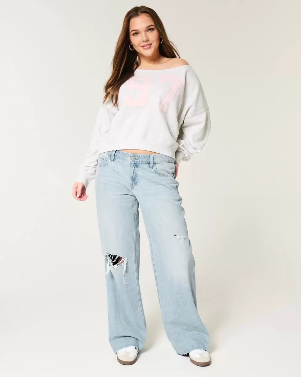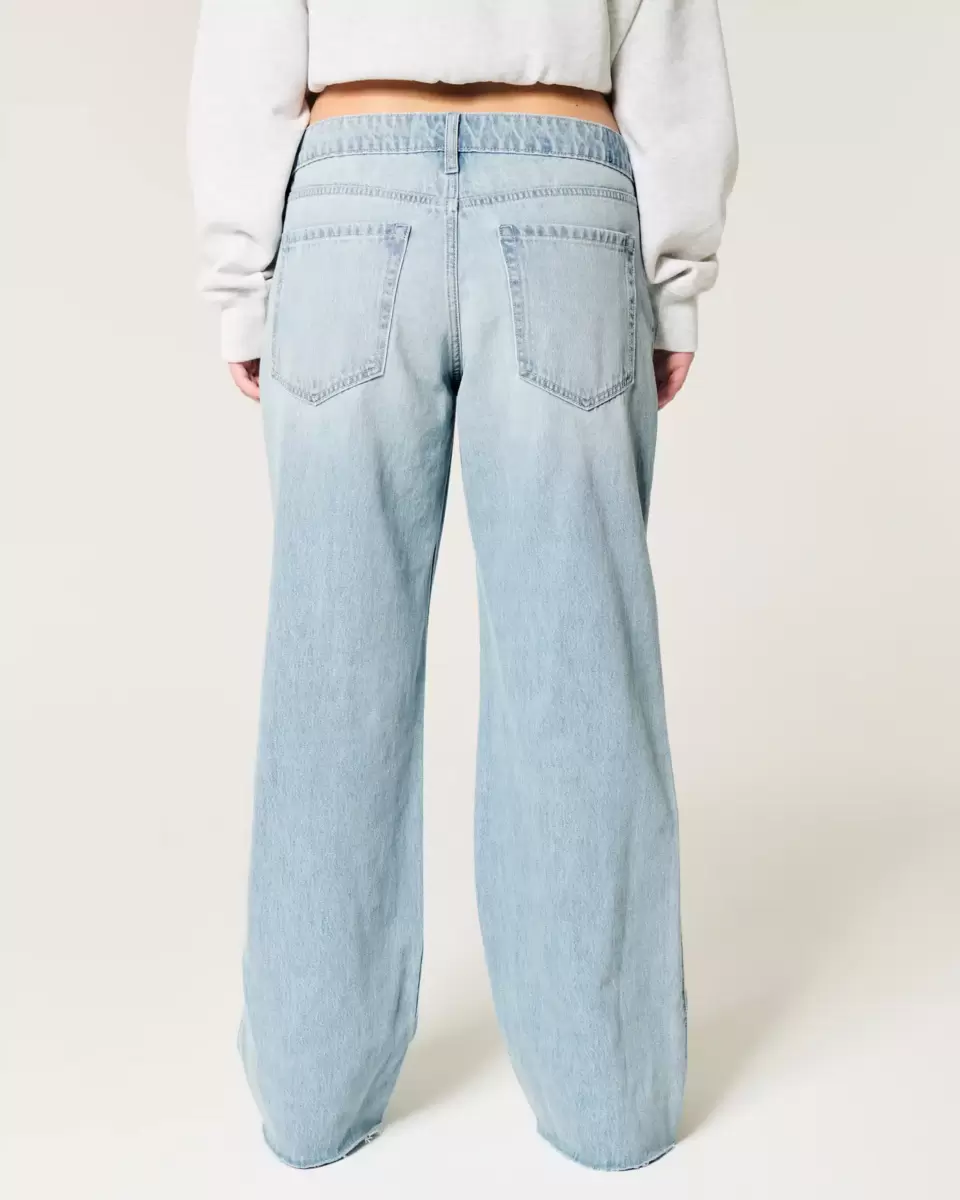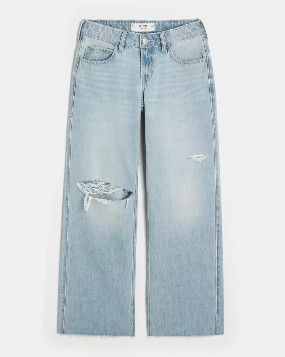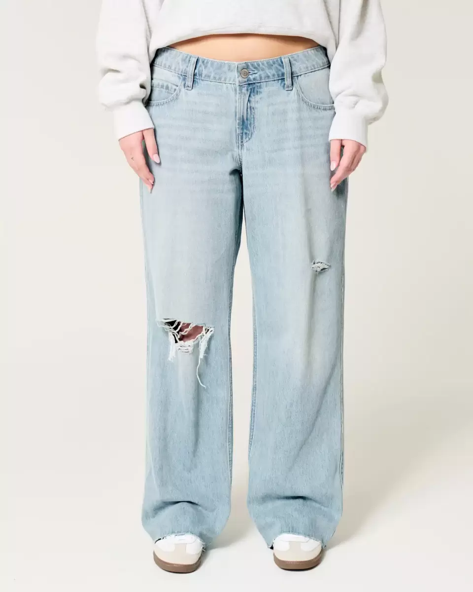 Jean ultra-confortable au délavage clair avec détails déchirés. Décoloration, effet moustaches, taille basse, jambe ample. Importé.