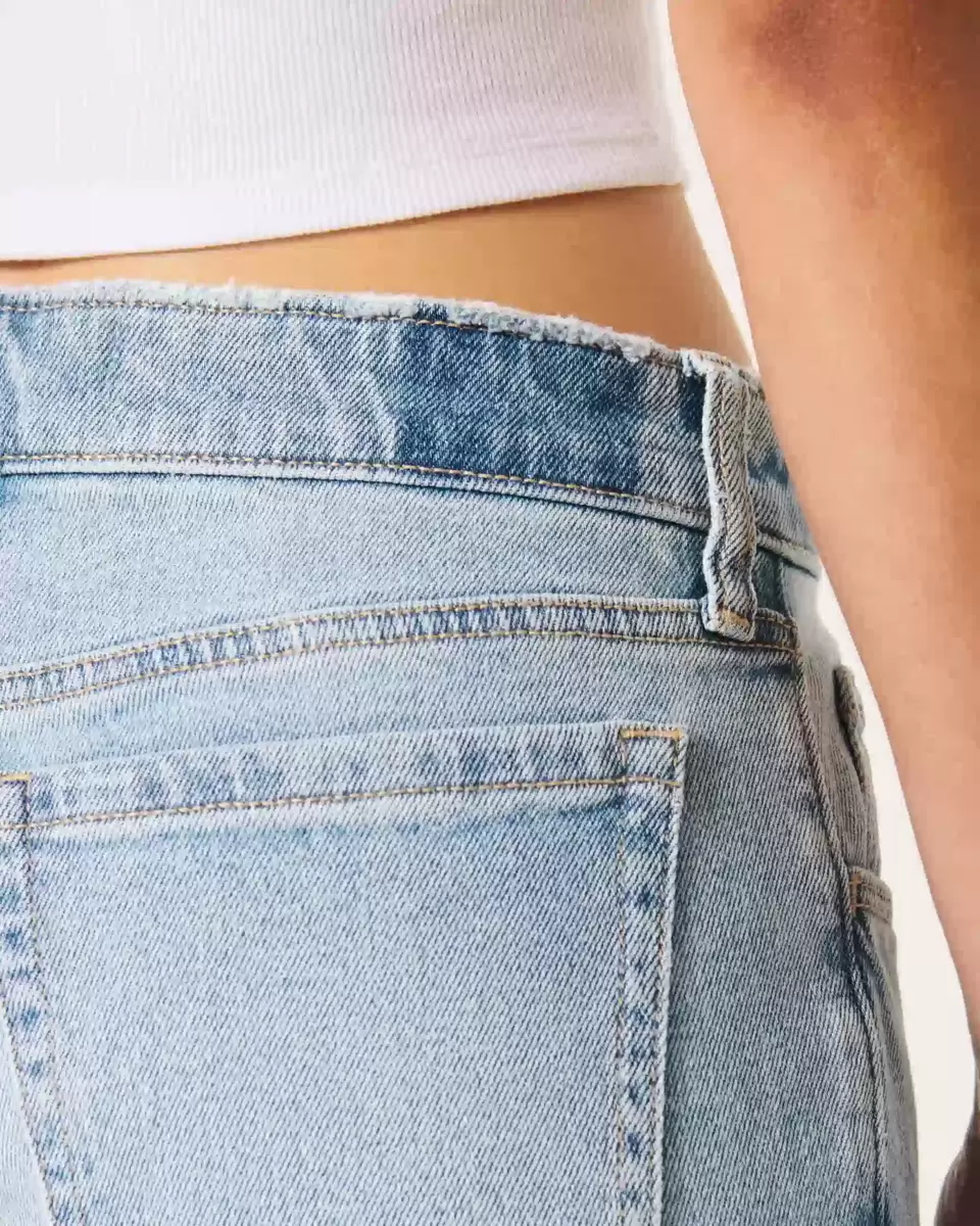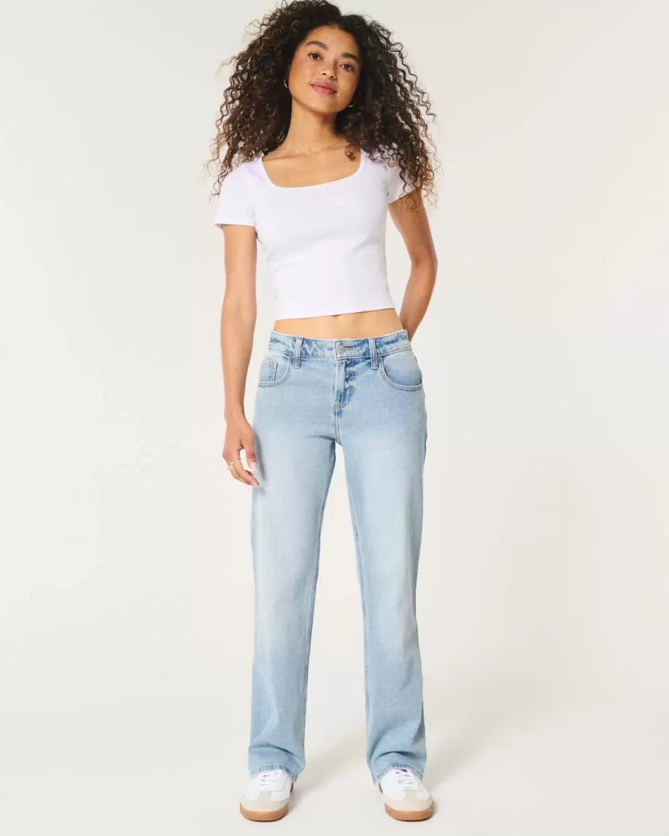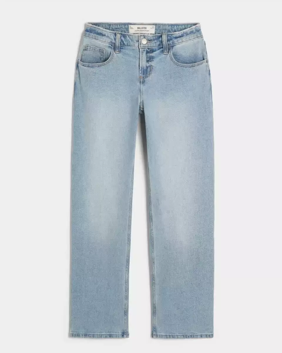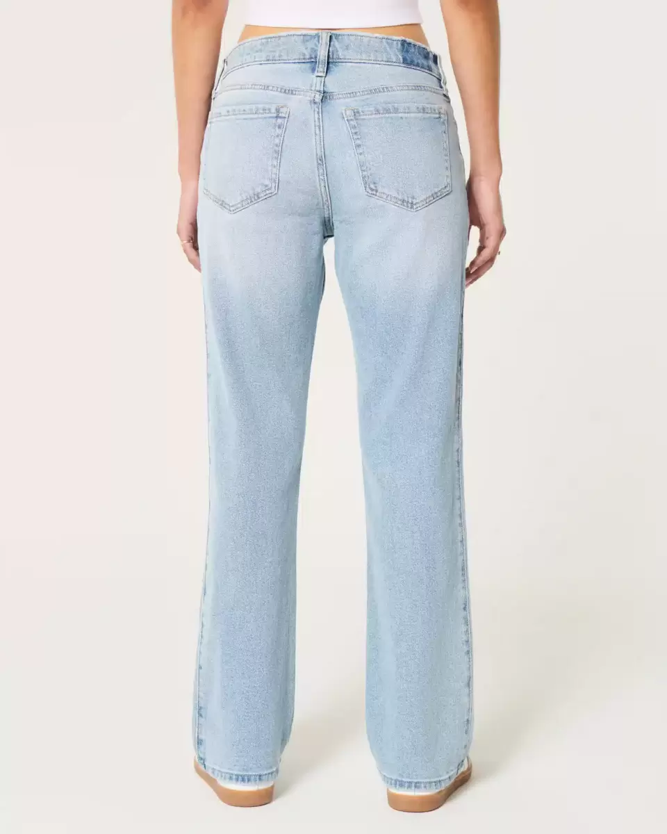 Jean confortable au délavage clair, coupe droite et décontractée. Décoloration sur la cuisse, taille basse. Importé.
