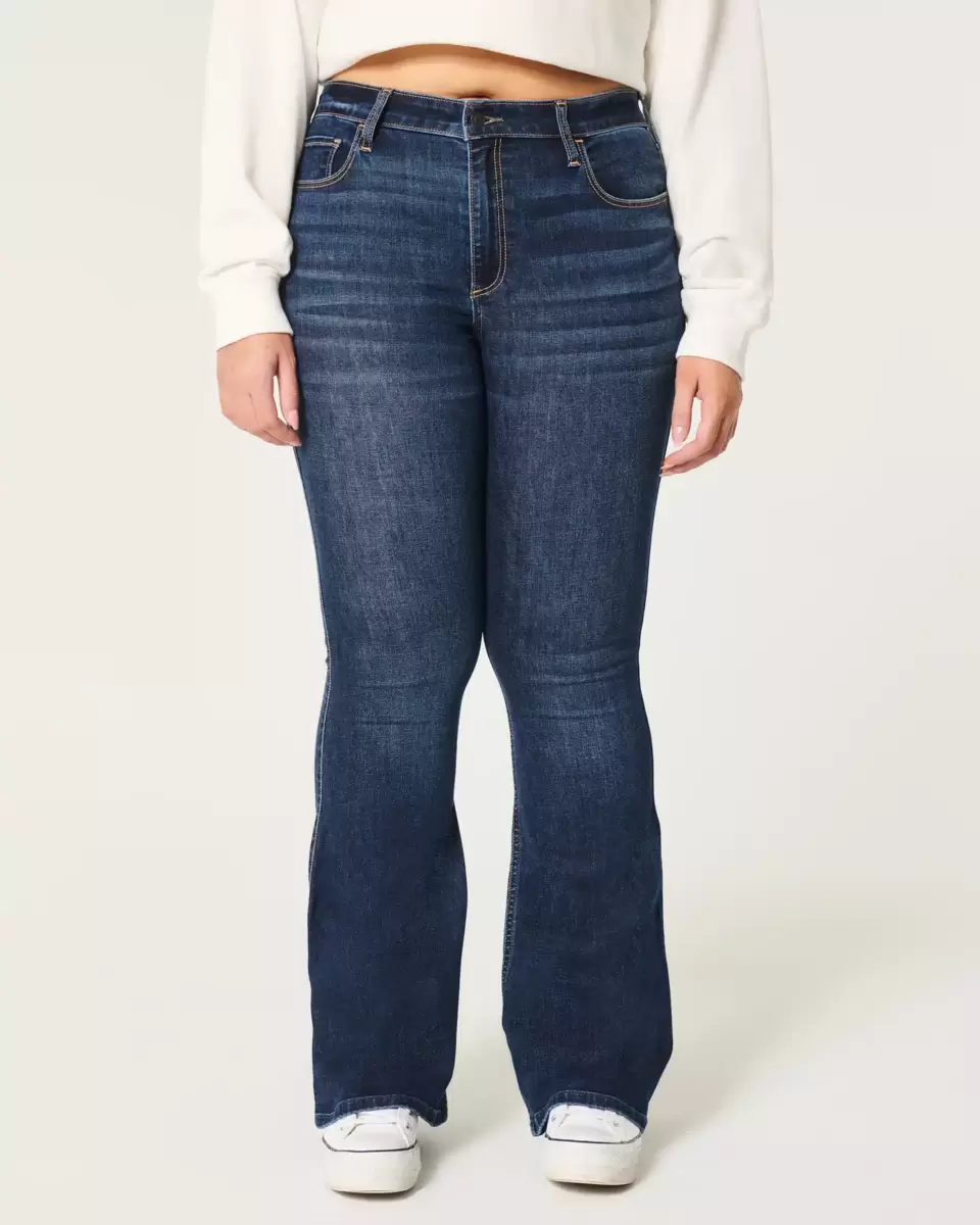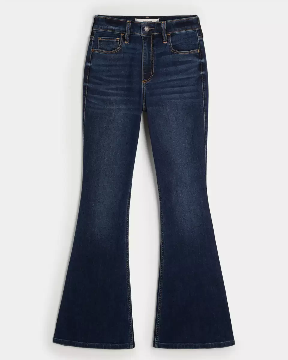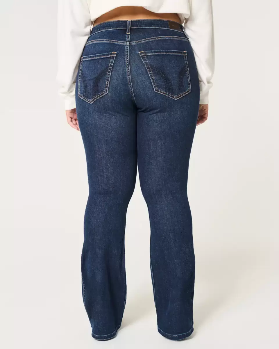 Conçu avec une taille haute, une jambe slim et un ourlet évasé. Denim foncé avec stretch, décoloration et moustaches. Importé.