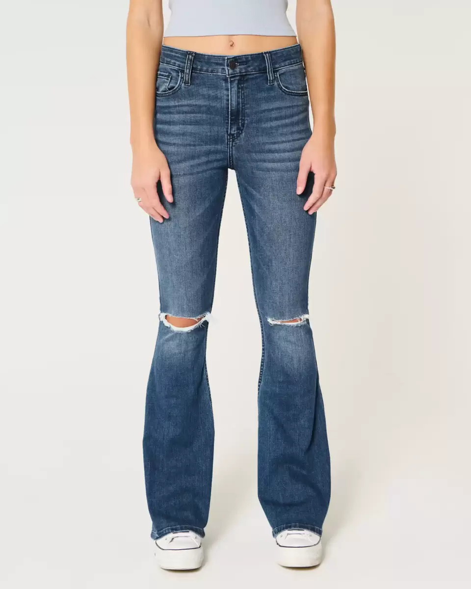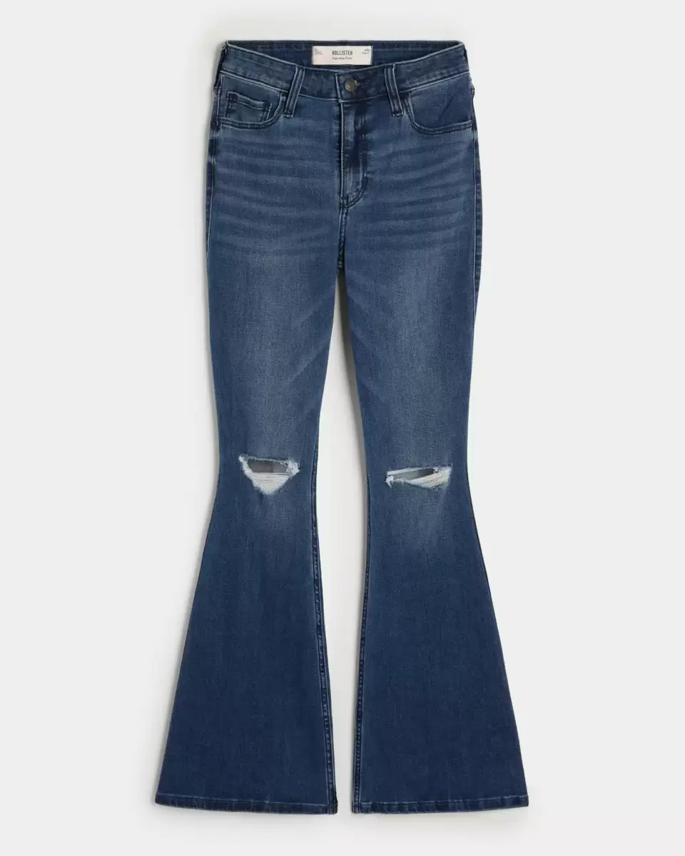 Conçu avec une taille haute flatteuse, ce jean au délavage moyen présente une jambe évasée d’inspiration rétro, des détails délavés, à moustaches et déchirés. Fabriqué en denim extensible ultra-confortable. Importé.