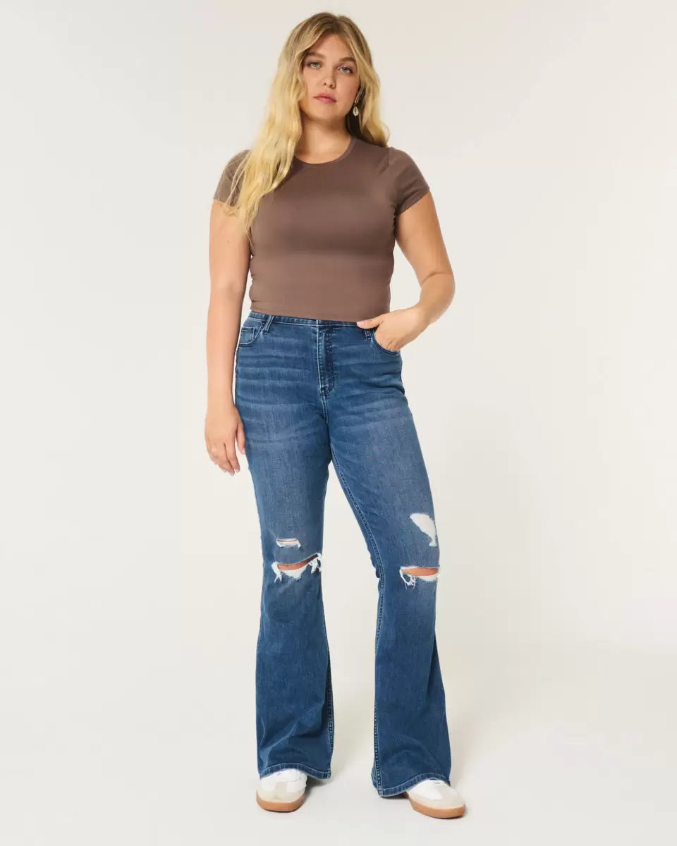 Jean extensible, confortable et mignon, délavage moyen, avec décoloration, moustaches et déchirures. Coupe slim, ourlet évasé et taille haute. Importé.