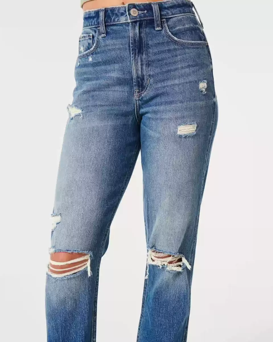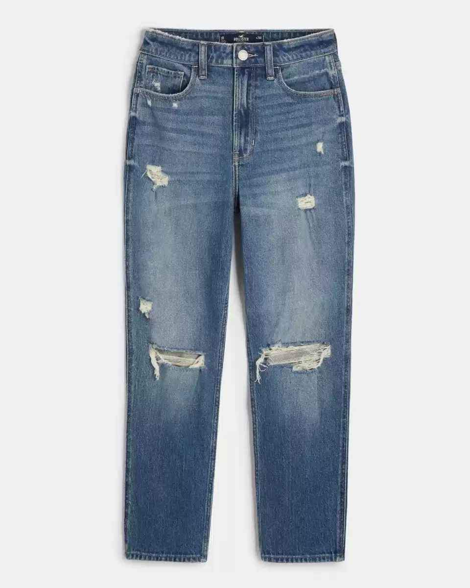 Décontracté jusqu’aux cuisses et fuselé du genou à la cheville, ce jean mom déchiré est confectionné en denim Vintage Stretch au délavage moyen, avec des détails déchirés, des décolorations et des moustaches. Il peut être porté avec ou sans revers ! Importé.