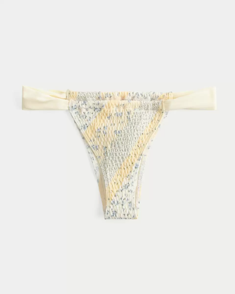 Ce bas de bikini mignon et confortable est confectionné dans un tissu de bain doux à smocks. Bretelles latérales, coupe échancrée et couverture ultra-cosy. Importé.