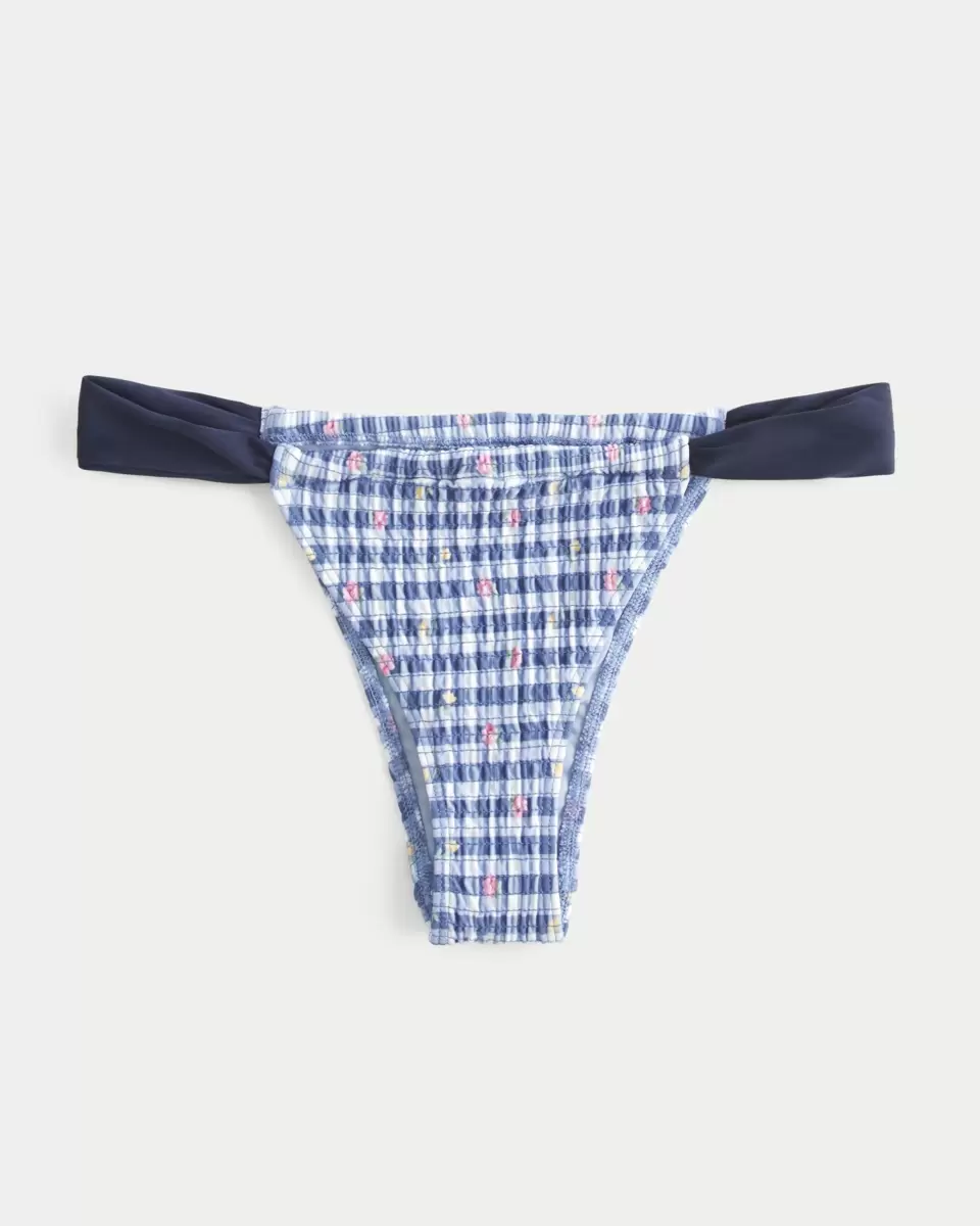 Ce bas de bikini mignon et confortable est confectionné dans un tissu de bain doux à smocks. Bretelles latérales, coupe échancrée et couverture ultra-cosy. Importé.