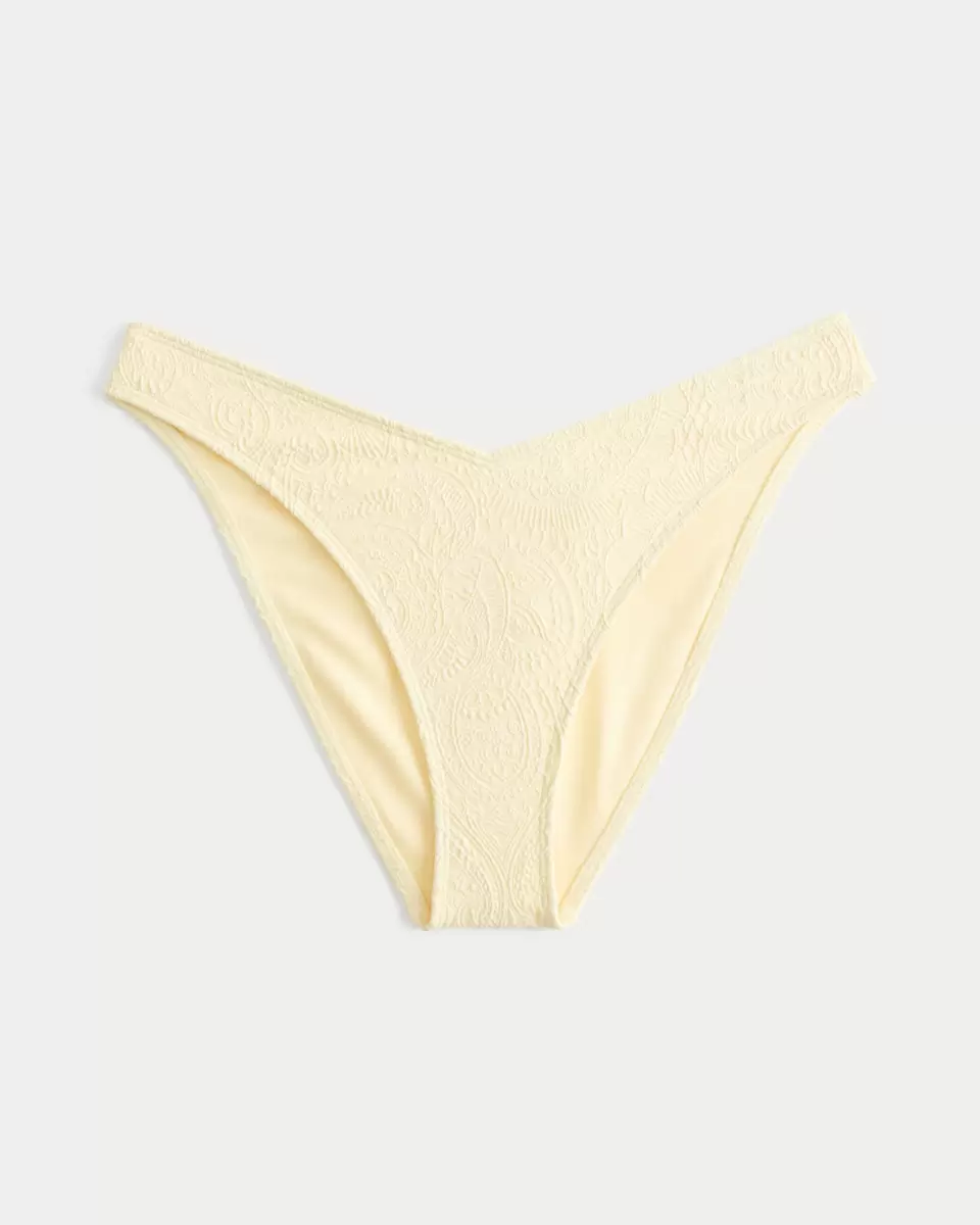 Un bas de bikini super mignon en tissu jacquard doux, conçu avec une coupe échancrée et une taille en V. Couvrance flatteuse. Importé.