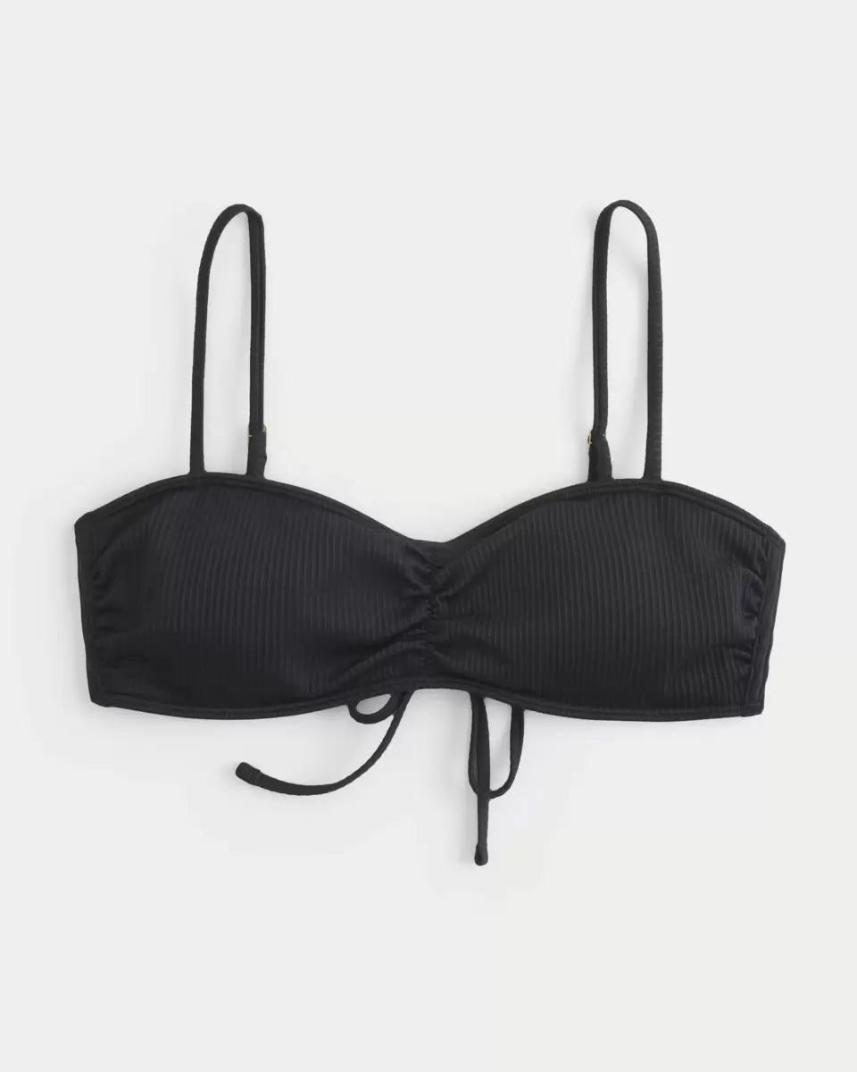 Un haut de bikini super mignon en tissu côtelé doux avec une encolure dégagée et des détails cintrés au centre. Bretelles réglables, fermeture à nouer dans le dos. Importé.