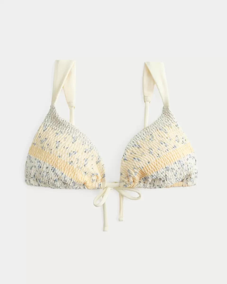 Joli et confortable, ce haut de bikini est confectionné dans un tissu de bain doux à smocks. Fermeture à nouer, bretelles sur les épaules, rembourrage amovible et coupe triangle. Importé.