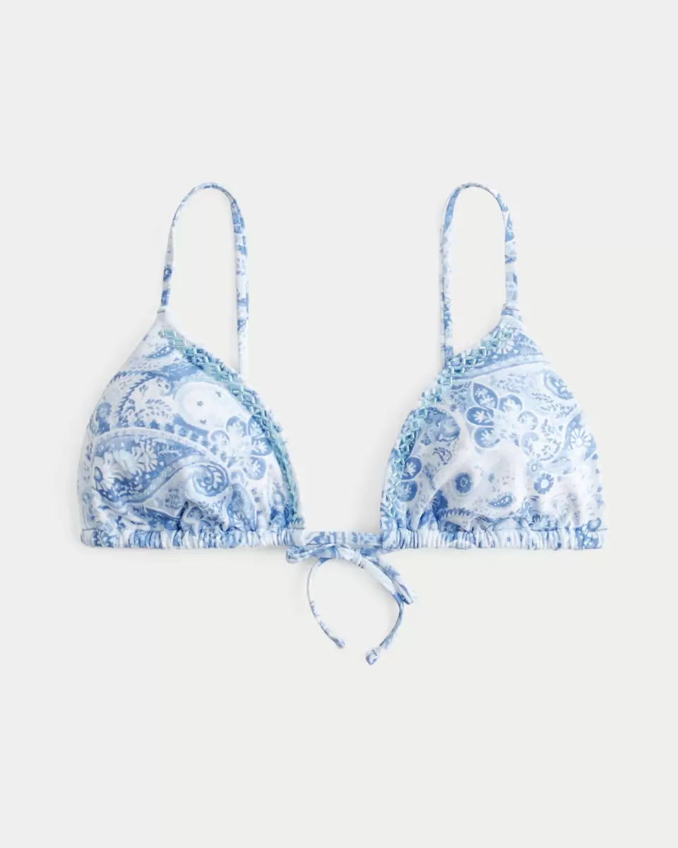 Un joli haut de bikini à la silhouette triangle classique. Rembourrage amovible, bretelles réglables, fermeture à nouer et détails perlés. Importé.