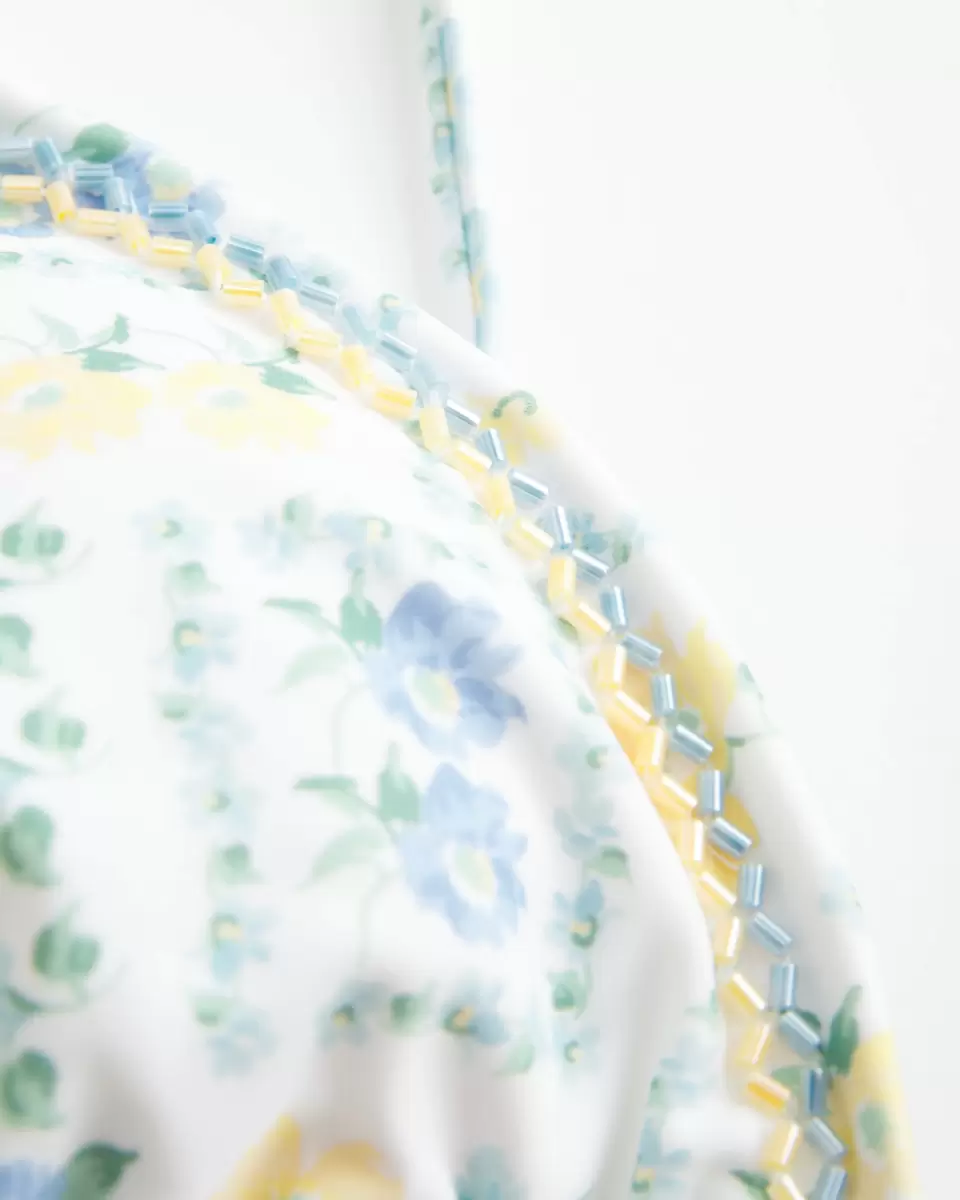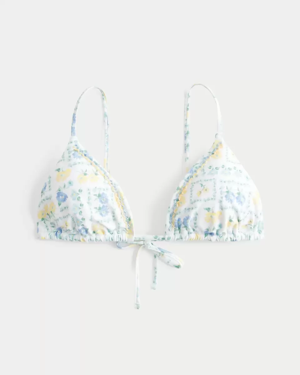 Un joli haut de bikini à la silhouette triangle classique. Rembourrage amovible, bretelles réglables, fermeture à nouer, détails perles. Importé.