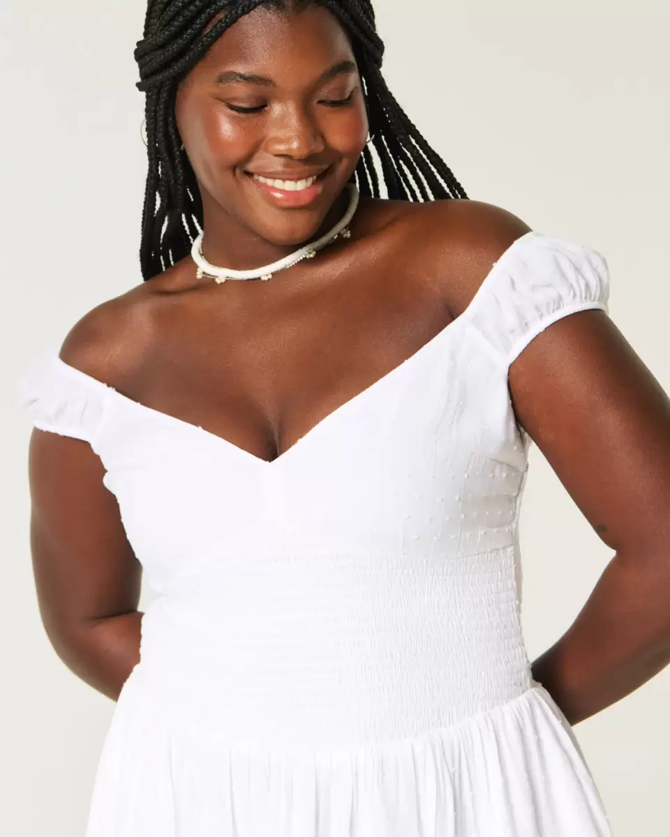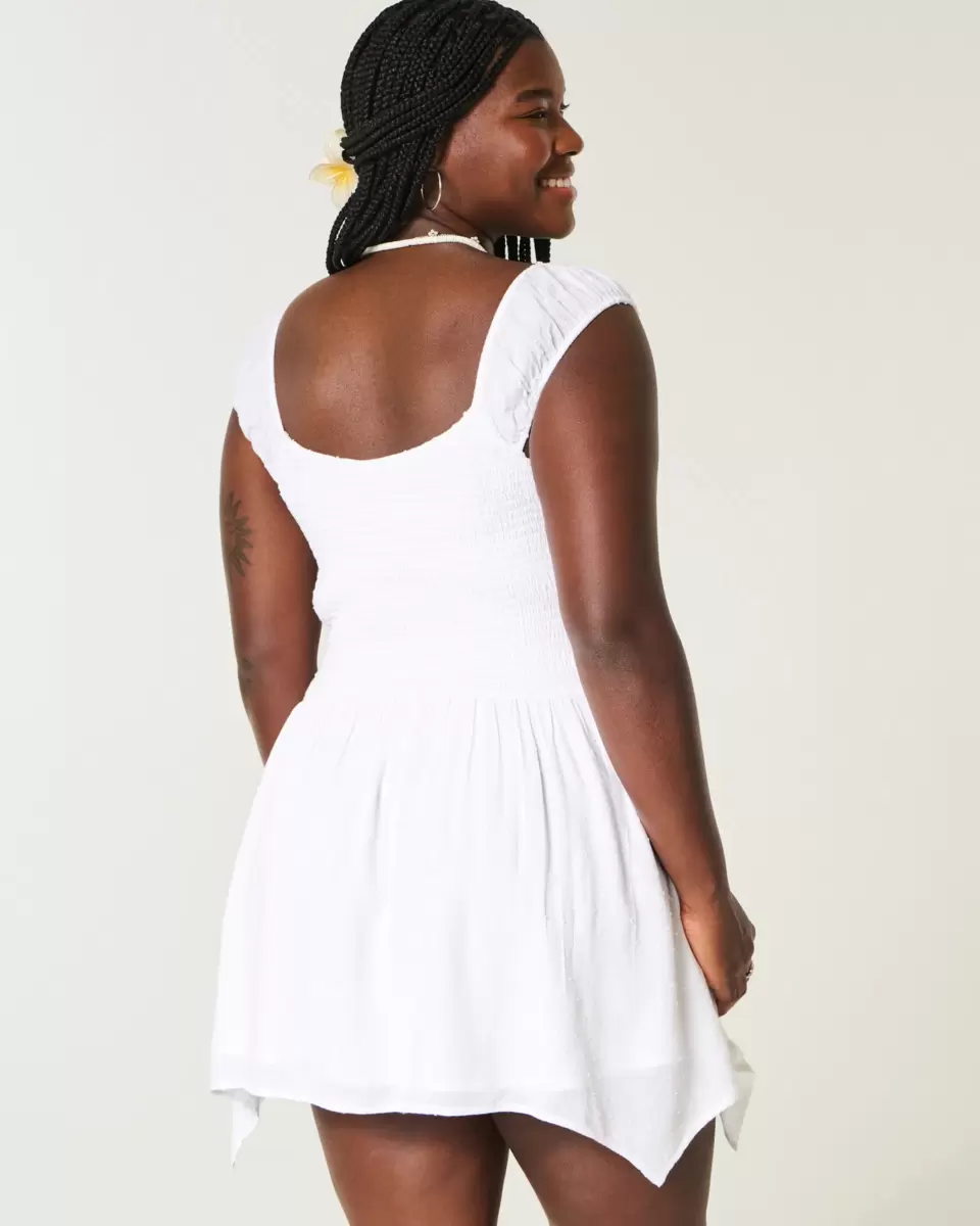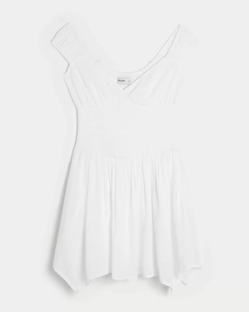 Jolie et ultra douce, cette mini-robe présente un ourlet asymétrique et des manches courtes à épaules dénudées. Taille smockée douce et poches. Importée.